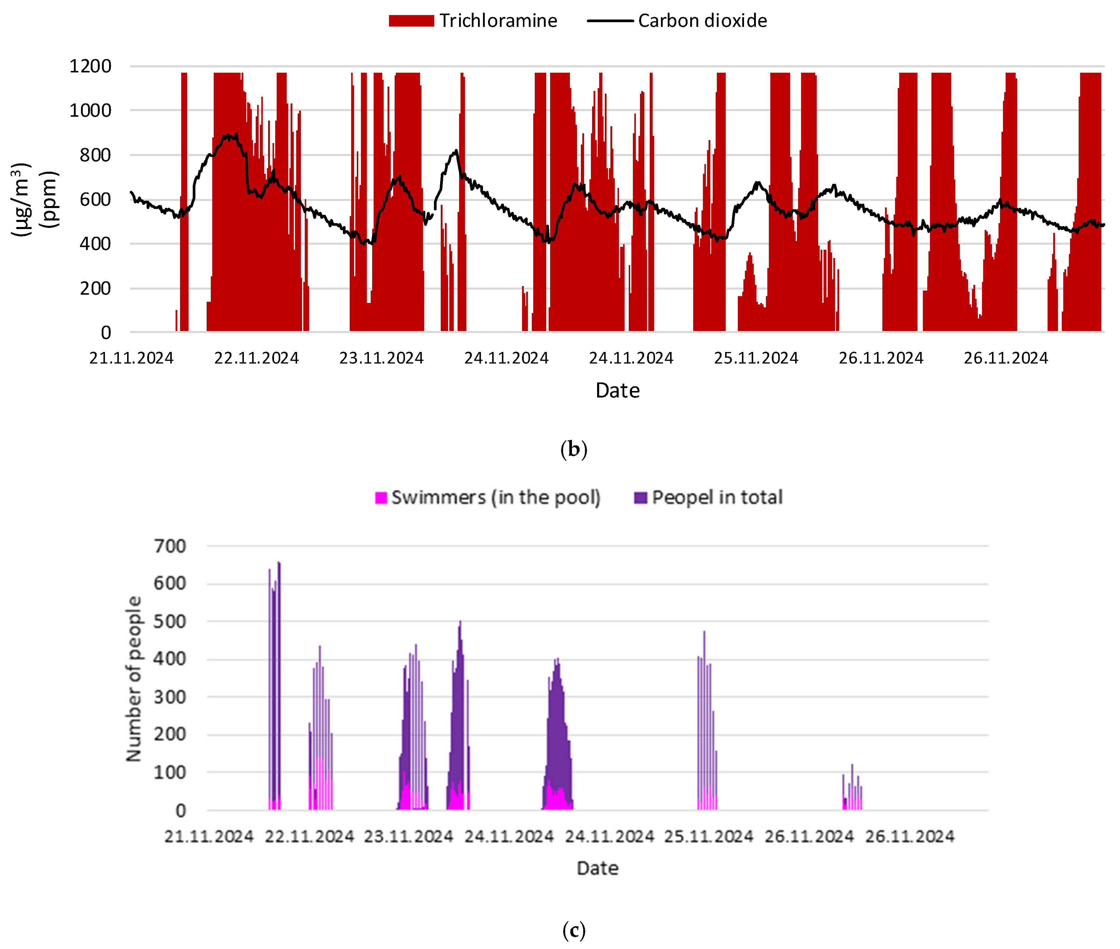 In summary, the conducted research demonstrates that while the ventilation system effectively maintained stable thermal conditions, it did not always prevent the accumulation of chlorinated by-products during periods of intensive use. Future studies should couple air quality monitoring with material degradation analyses to develop design and operational recommendations that enhance the long-term durability of indoor swimming pool infrastructure.