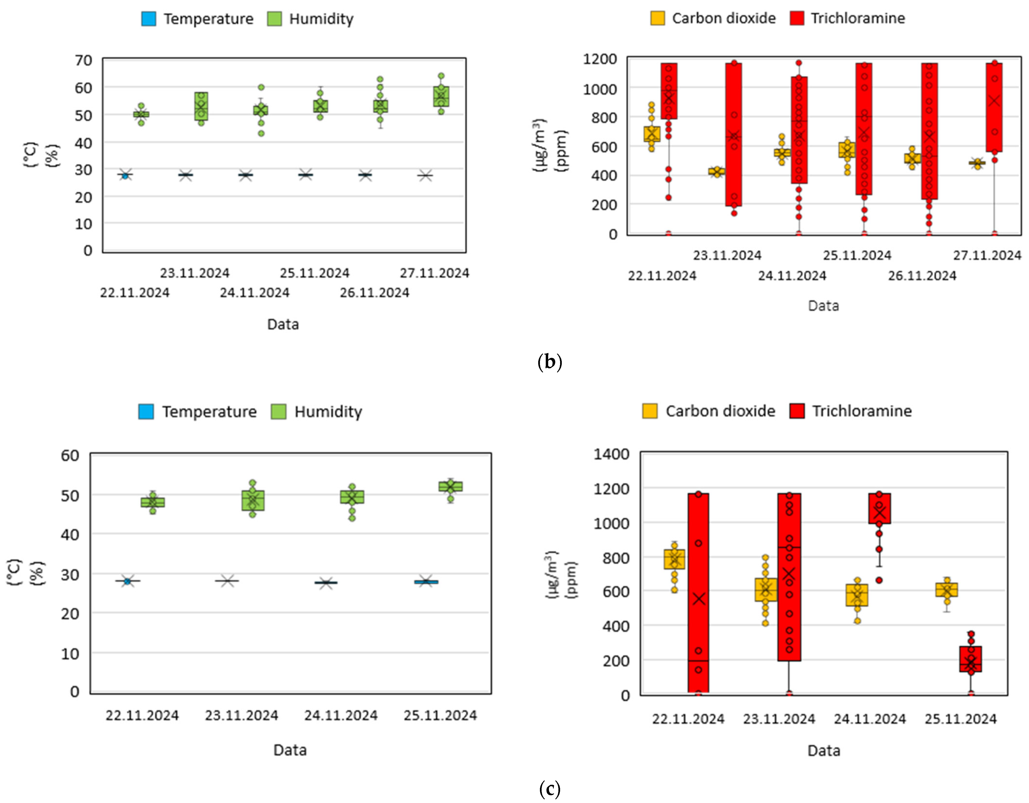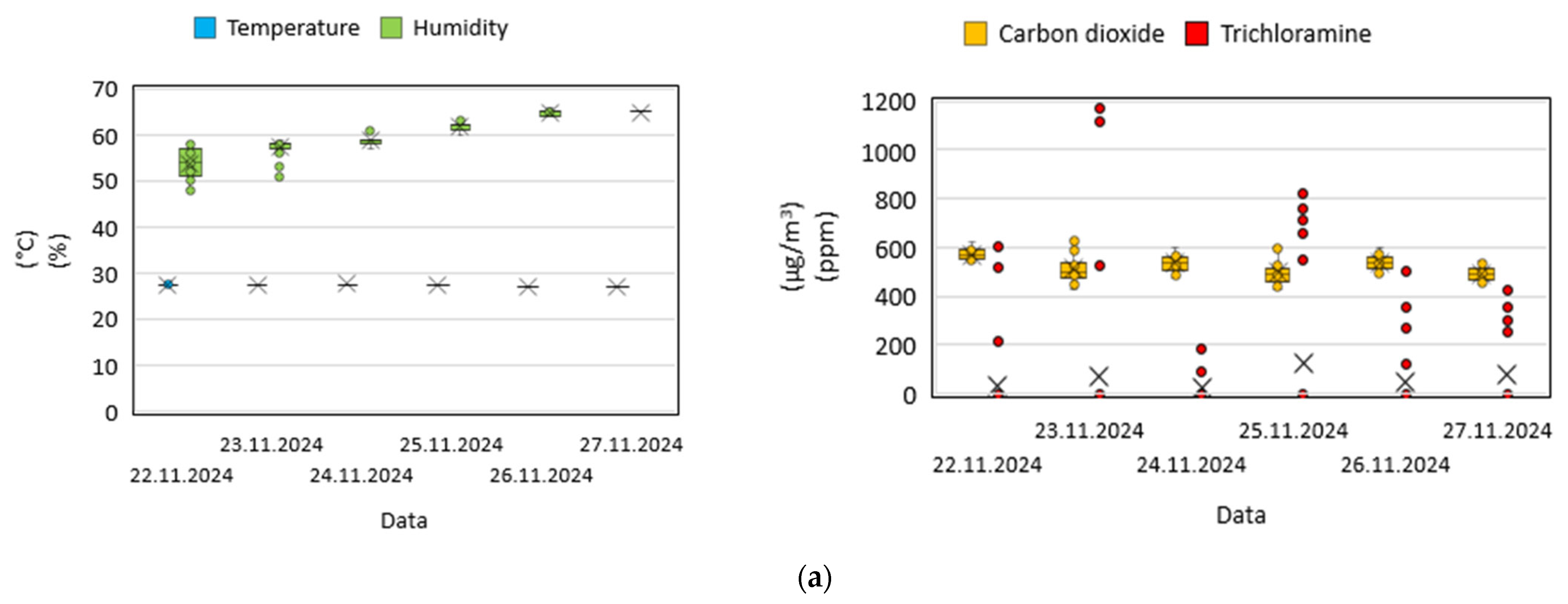 Figure 4). The analysis was conducted both in a comprehensive manner and with differentiation by individual days and operating modes. The study considered three modes of operation: competition, normal, and nighttime. Four key air quality parameters were measured: air temperature, relative humidity, carbon dioxide concentration, and trichloramine concentration.