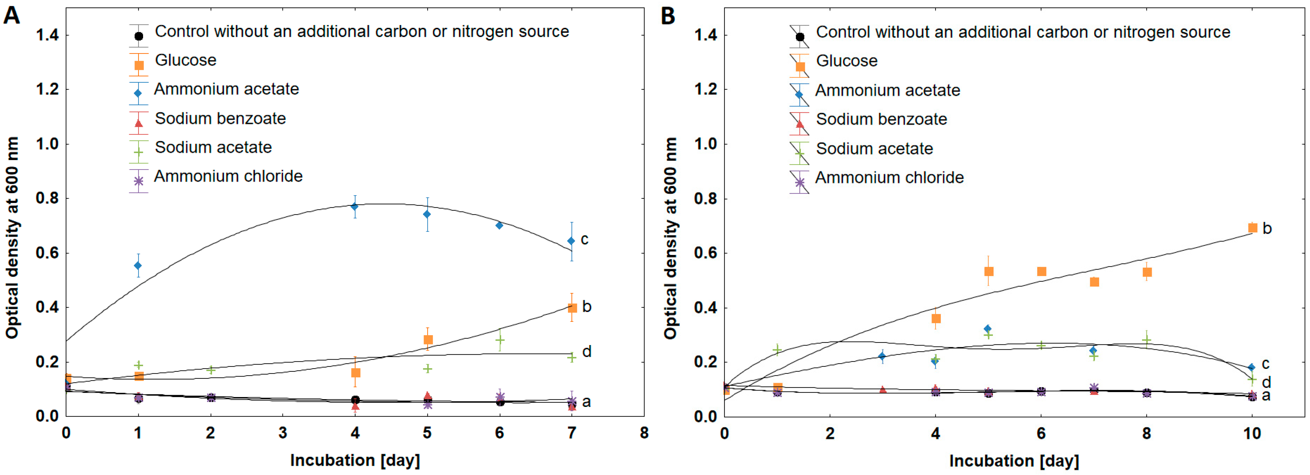 2.4. Various Carbon and Nitrogen Sources Impact Culture Growth and Drug Degradation Dynamics