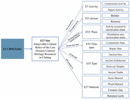 In the field of cultural heritage semantic modeling, the internationally recognized CIDOC CRM (Conceptual Reference Model) is widely adopted. Based on the core architecture of the CIDOC CRM v7.2 model, and referring to its classes and properties system, the model is appropriately trimmed and extended to account for the specific characteristics of Chifeng’s Liao dynasty heritage resources. Local semantic subclasses, such as Liao dynasty place names, Liao dynasty architectural types, and inscription information, are added to ensure the completeness of the semantic expressions within the project’s domain.