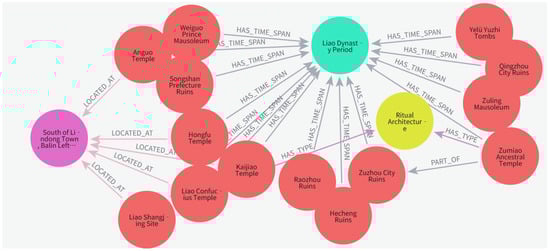 After completing the ontology modeling, methods such as text mining, entity recognition, and rule extraction are used to extract triples conforming to the CIDOC structure from historical texts, which are then mapped to the ontology model for instantiation. Finally, the structured data is imported into the Neo4j graph database in RDF or TTL format, creating the knowledge graph for immovable cultural heritage of the Liao dynasty in Chifeng. This graph enables the visualization of entities, relationships, temporal, and spatial information, along with semantic query support []. The construction of the Chifeng Liao dynasty cultural heritage ontology is shown in Figure 2.