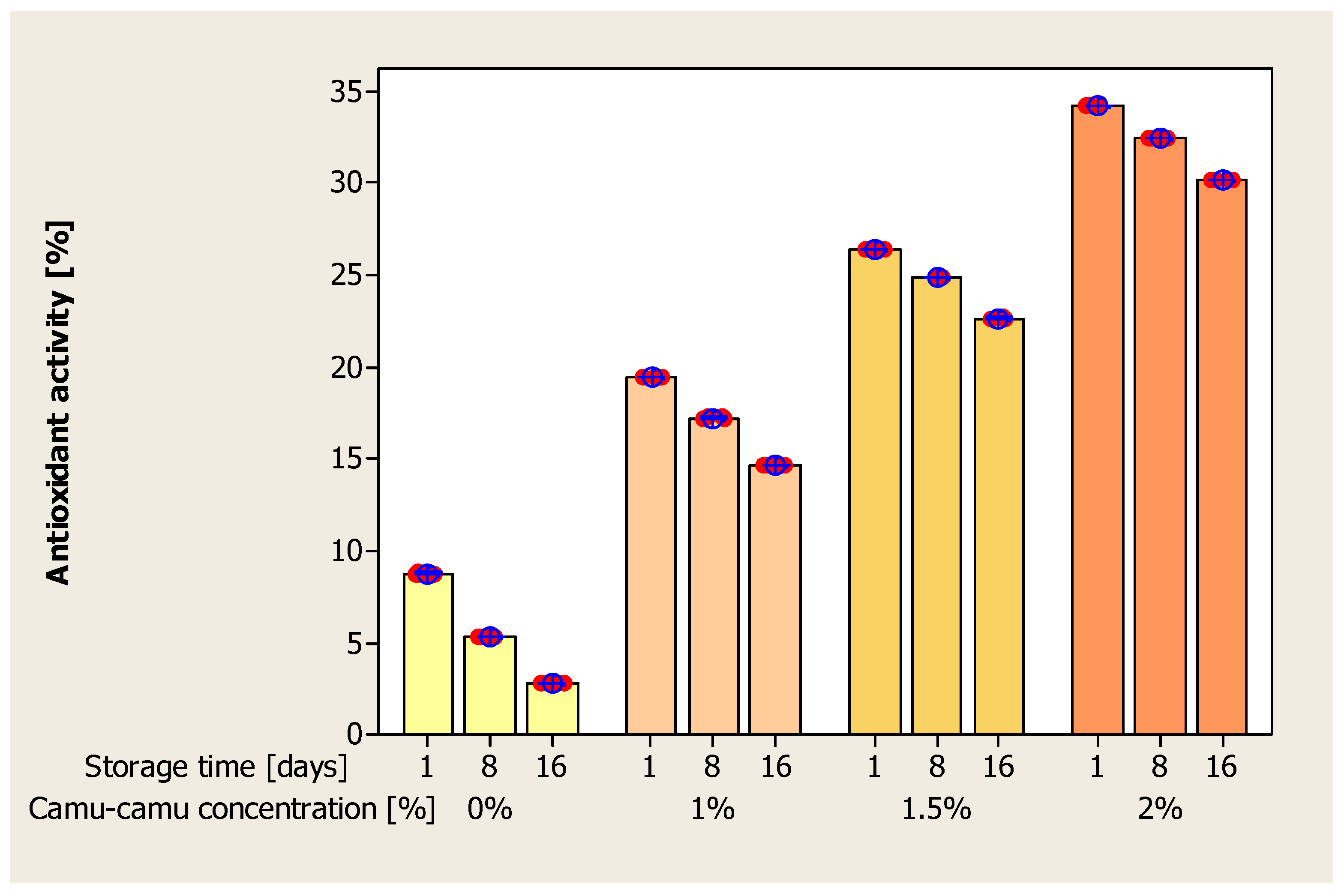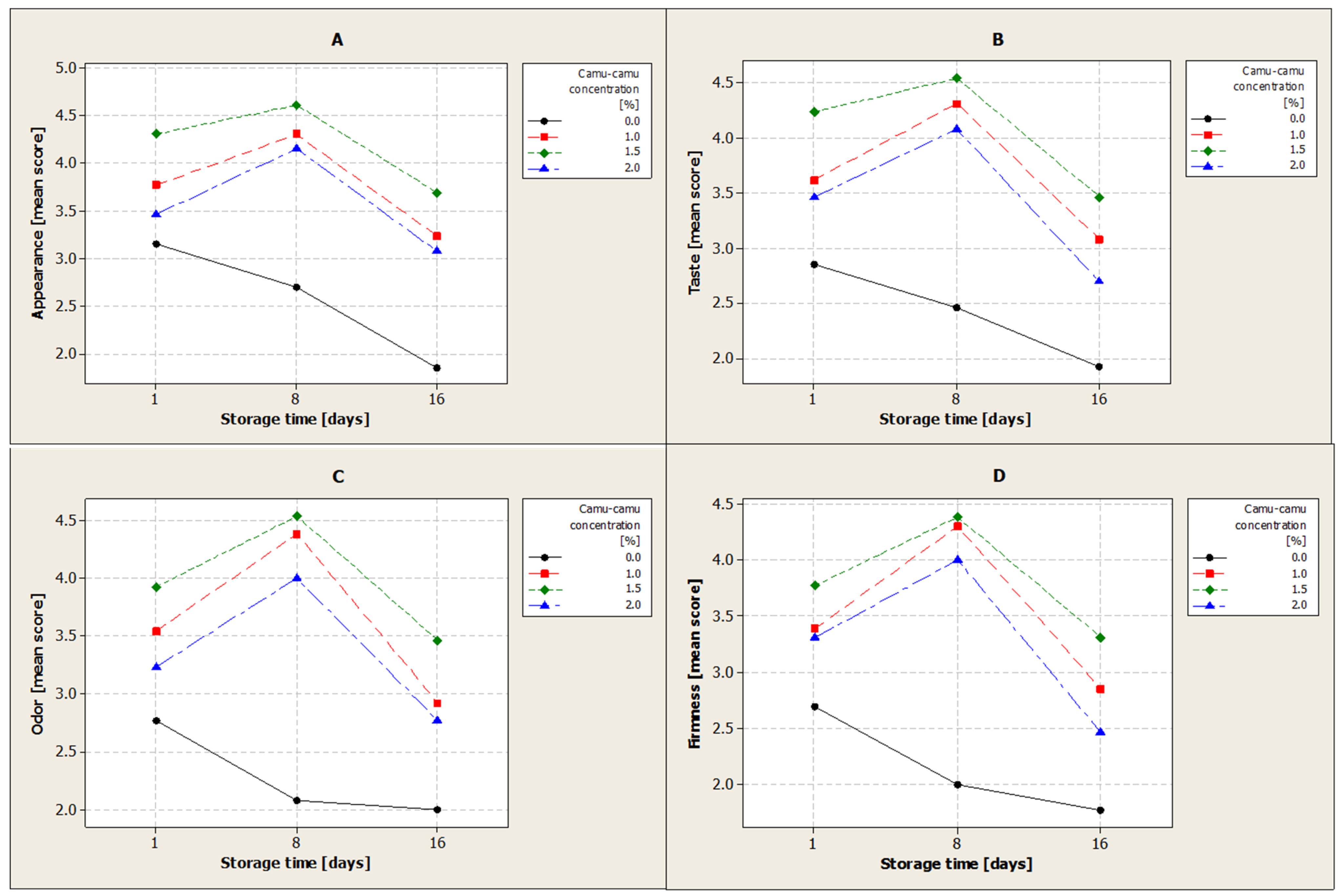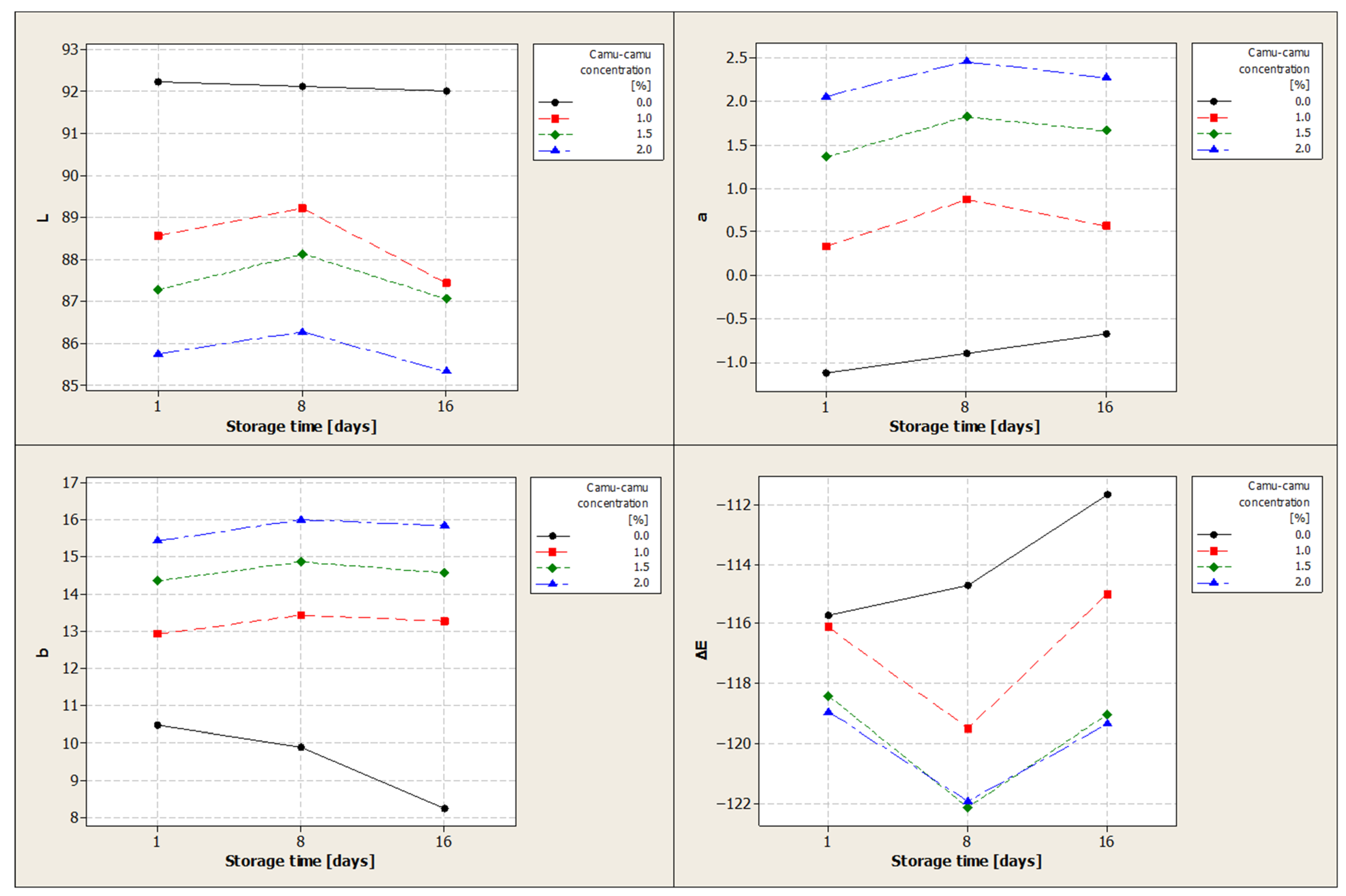 | Item | Camu-Camu Concentration [%] | Storage Time [Days] | ||