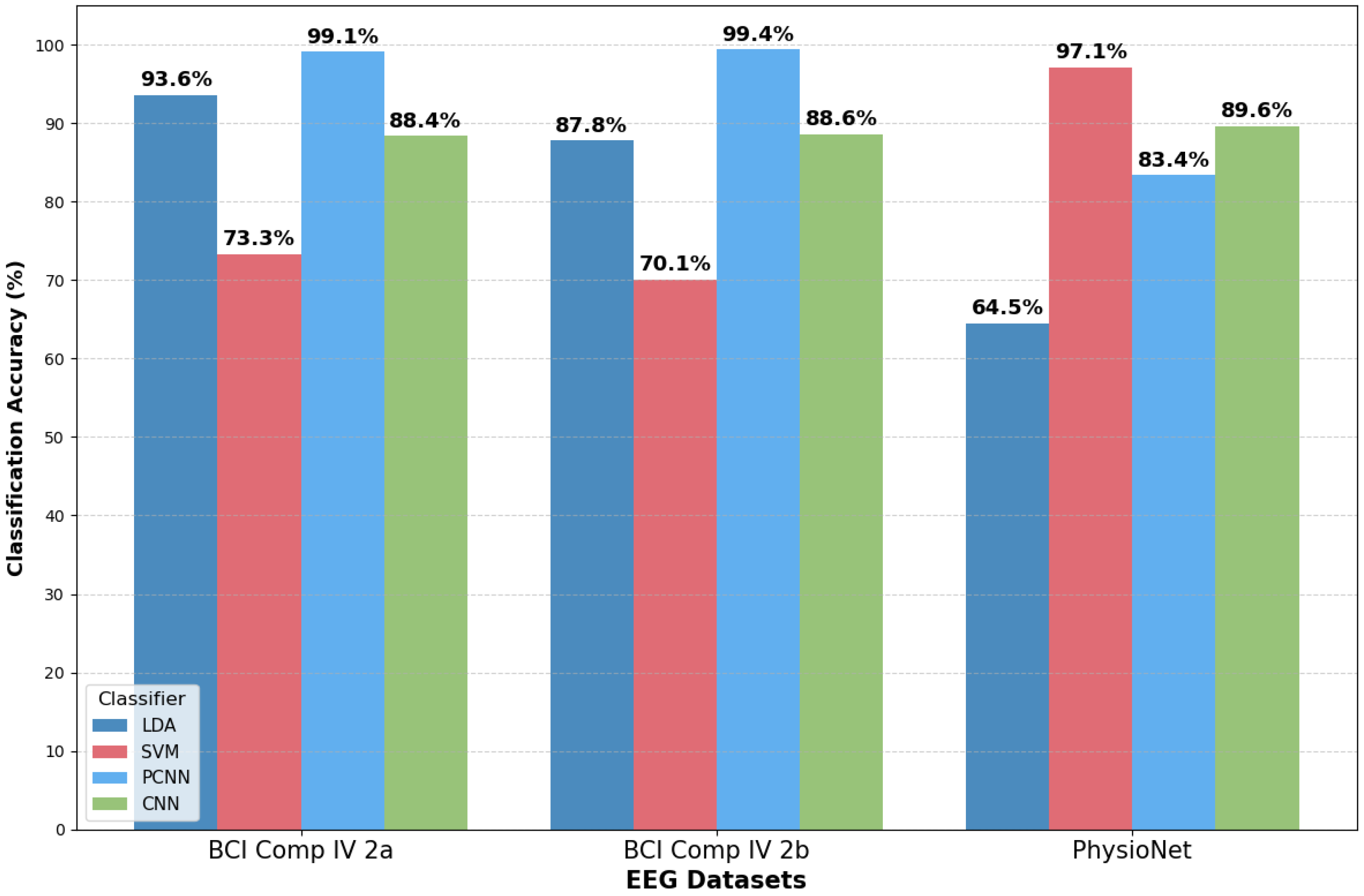 | BCI Competition IV 2b [29] | - | Raw EEG (Conv Input) | CNN | 88.6% (4-class) | Small improvement despite higher class count |