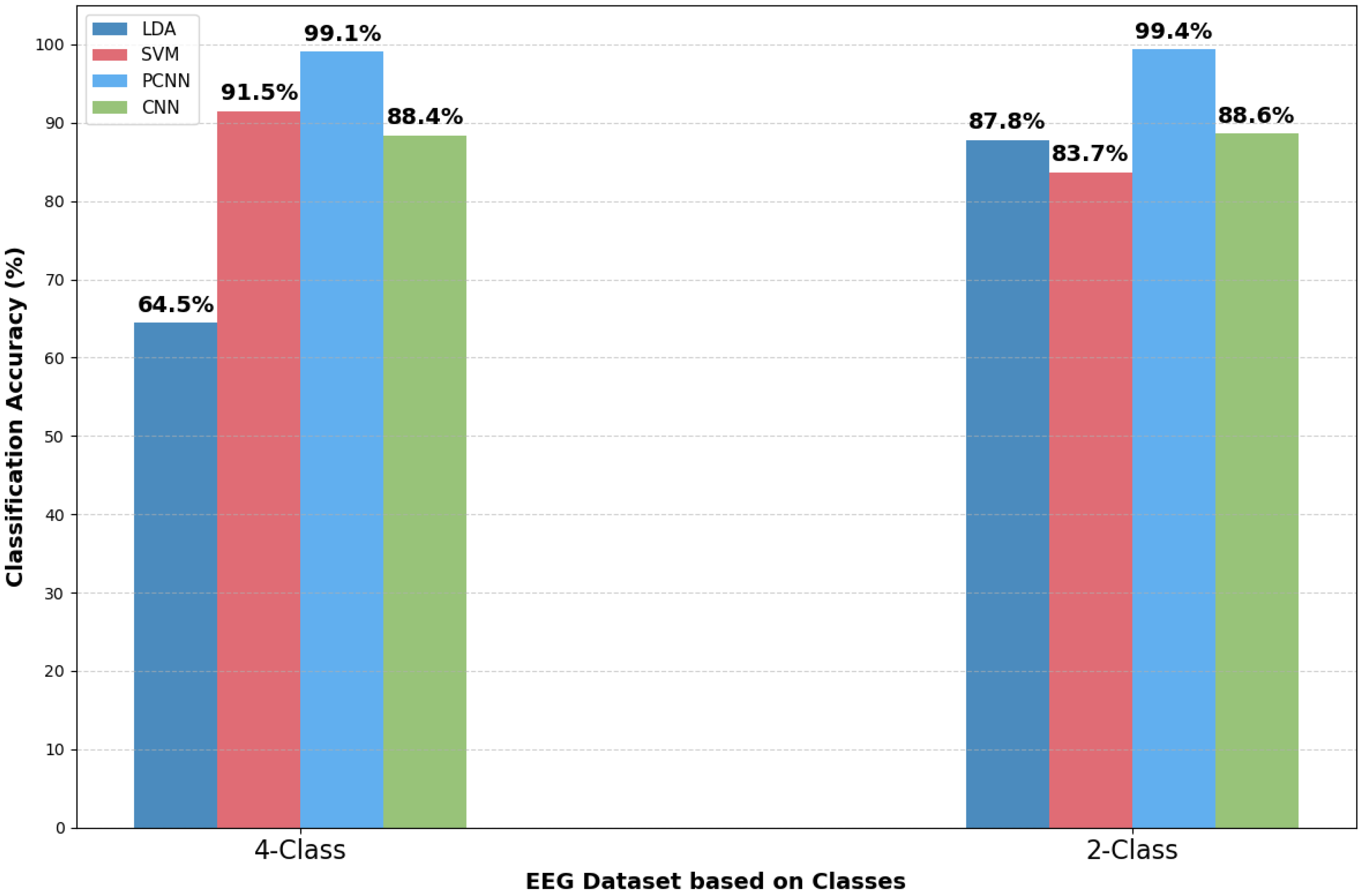 | BCI Competition IV 2b [27] | Bandpass + Notch filter | EMD | PCNN | 99.39% (4-class) | Effective multiclass separation |