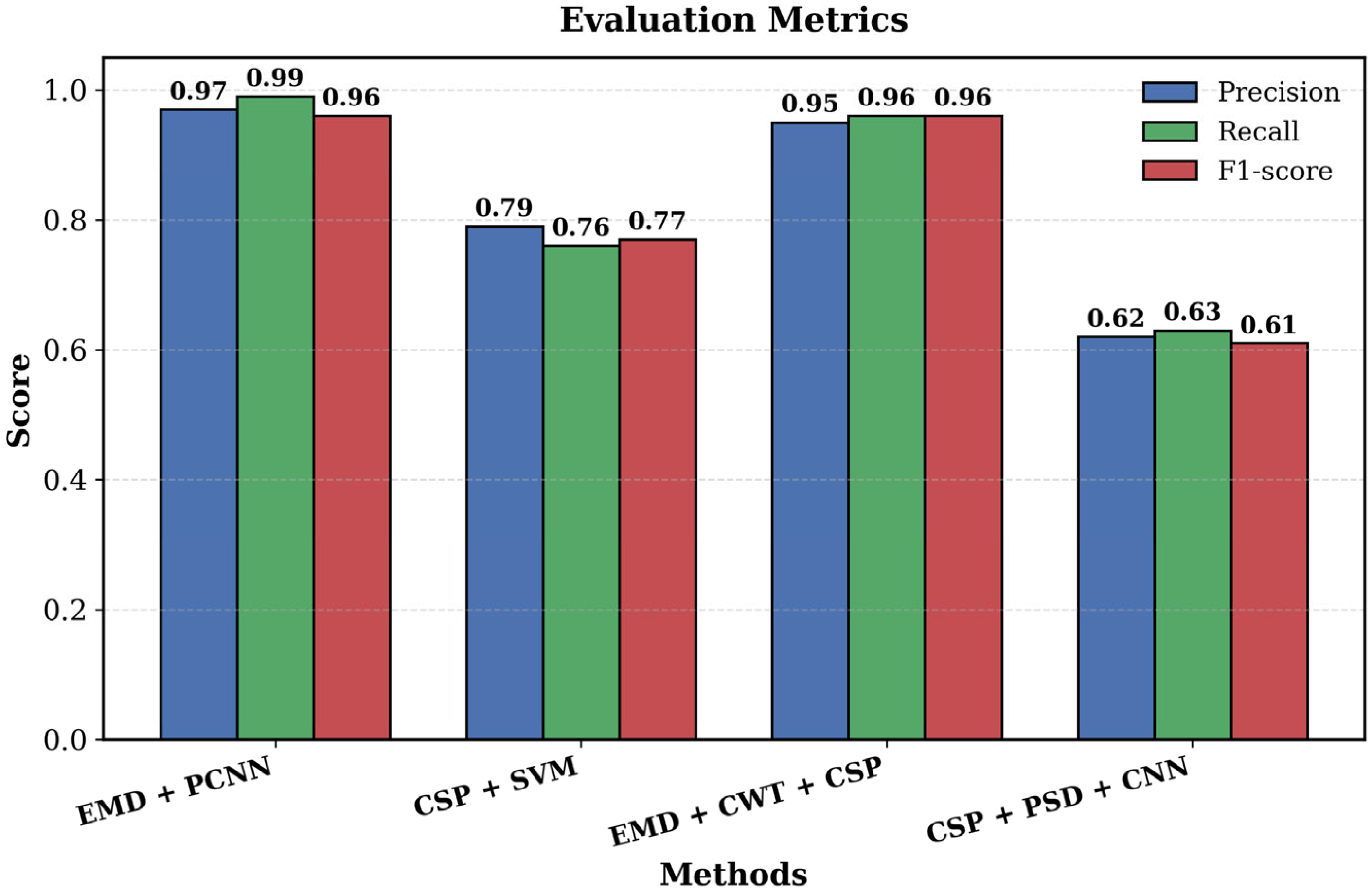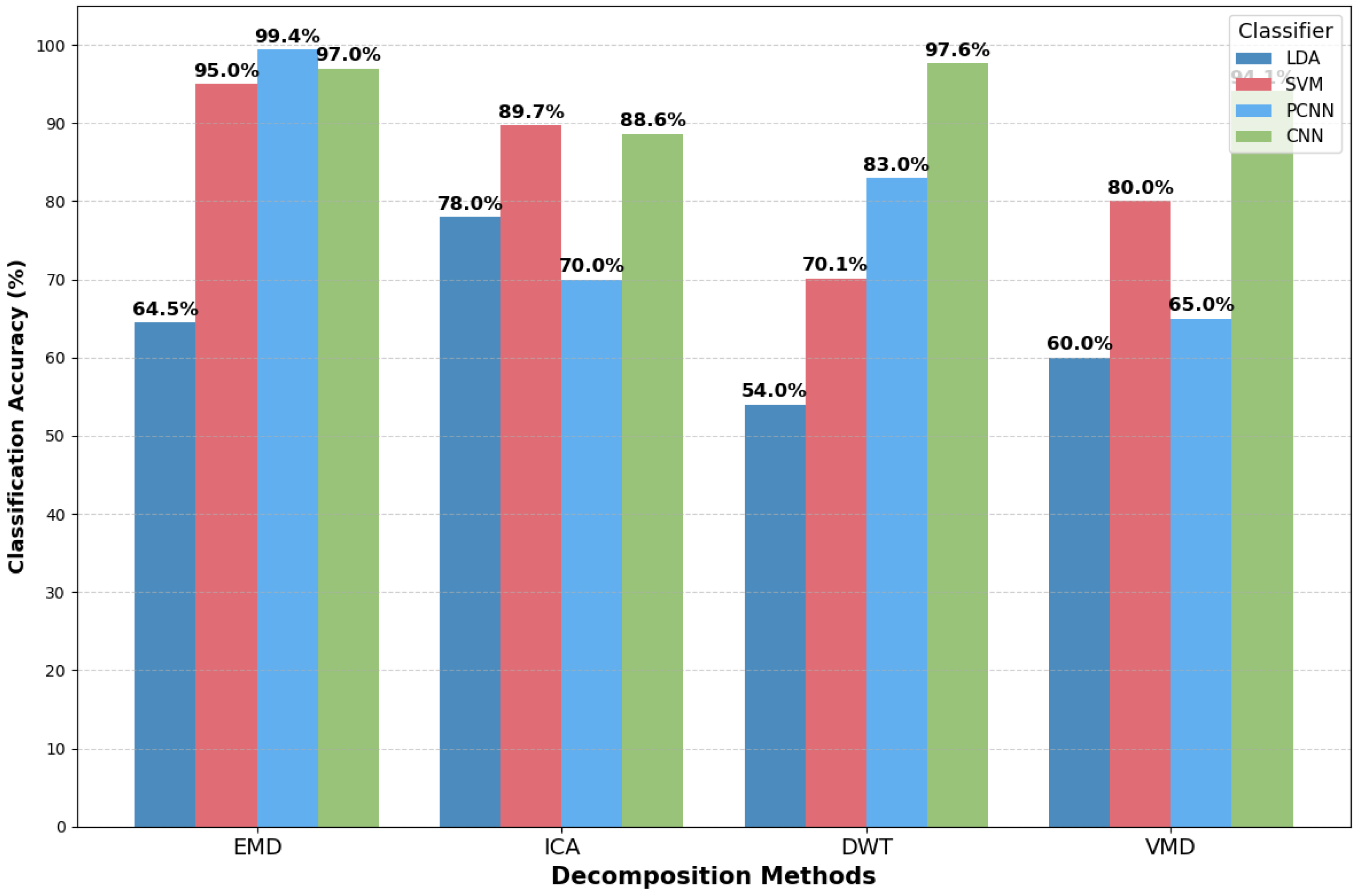 | BCI Competition IV 2a [27] | Bandpass + Notch filter | EMD | PCNN | 99.1% (2-class) | Strong robustness via IMF decomposition |