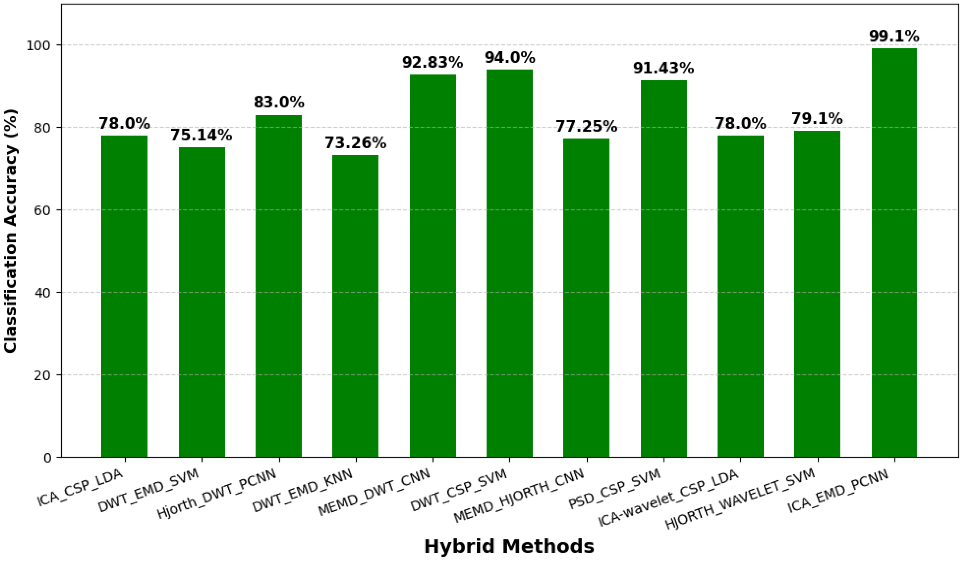 | Hybrid (EMD + CNN, CSP + LSTM) | Combines feature decomposition with deep learning, achieving state-of-the-art accuracies (>99%) | Increased computational cost, risk of overfitting on small datasets. |