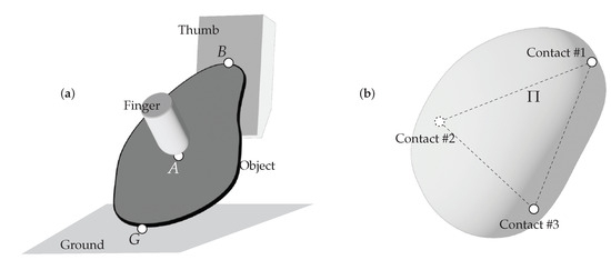 At each contact G, A, and B (Figure 5a), the friction cone intersects the -plane—the plane containing the line and normal to the object’s surface—such that the intersection forms a proper planar cone.