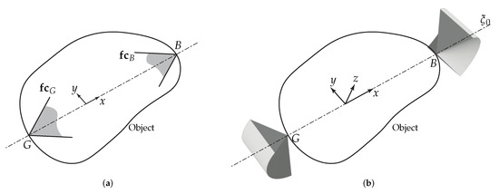 Before executing a planned motion, it is assumed the object is already held in a pinch grasp where (Figure 2) with the digits aligned along the -plane. Achieving this alignment may require reorienting the object within the grasp—a problem that has been studied for essentially planar objects pinched at their faces [27,28]. Such preparatory actions ensure proper alignment before ungrasping begins. During execution, however, unlike in the purely planar case, the rolling axes at G (for the object) and at B (for the thumb) are generally non-parallel, which necessitates full three-dimensional motion control.