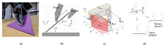 Algorithm 1 [1] presents our motion planning algorithm for planar dexterous ungrasping. Building on a variant of the rapidly-exploring random tree (RRT) algorithm, specifically, RRT* [20] which converges to an optimal solution, Algorithm 1 produces an optimal (based on a suitable criterion) path from an initial configuration , where the object is in a pinch grasp, to a final configuration , where the object is positioned on a target surface. A returned motion path is represented as a sequence of motion primitives—elementary units of movement parameterized by contact type and location, thereby standardizing the contact interactions among the bodies involved: the object, the robot’s digits, and the target surface. As shown in Figure 2, which illustrates instances of these motion primitives, these bodies interact through three rigid, unilateral, frictional point contacts G (on the target surface), A (on the finger), and B (on the thumb). Each motion primitive is thus defined based on the specification of the contact mode at G, A, and B, which can be sliding or rolling/fixed. For example, in the primitive (Figure 2a,b), G and A are rolling (denoted by ) and B is sliding (denoted by ): the contact locations of G and A remain fixed, whereas the contact point B moves along the thumb. Algorithm 1 expands the search tree by iteratively adding a new node when it is reachable using these motion primitives, and force-closure—i.e., the composite wrench cone spans the entire wrench space [21]—is attainable along the way to securely keep hold of the object. Because force-closure is required, the friction coefficients at G, A, and B—denoted , , and , respectively—are critical parameters in the algorithm. An example of a computed motion plan is shown in Figure 3. Note, the primitives shown in Figure 2a,b, a–c and a–d, respectively were designed for traversing along the -, -, and -directions, respectively, within the three-dimensional configuration space depicted in Figure 3b.