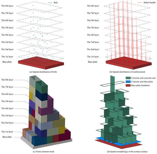 Contact interactions were defined between adjacent concrete units, between the bottommost units and the concrete base plate, and between the base plate and the foundation. Complex interactions between these components were simulated by establishing contact pairs and applying nonlinear contact models. The spatial configuration of the defined contact surfaces is presented in Figure 5d. Furthermore, bolts and reinforcement bars are embedded within the concrete units. Embedded region constraints were applied to model the interaction between the bolts/reinforcement and the surrounding concrete elements. The materials and computational parameters used in the FE analysis are summarized in Table 2.
