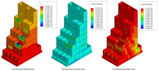Taking typical condition 1 (high water level) from Table 1 as an example, an in-depth analysis of the mechanical performance of the prefabricated reinforced guide wall is conducted. The horizontal displacement contour of the guide wall is shown in Figure 6a, while the distributions of the maximum and minimum principal stresses are presented in Figure 6b and Figure 6c, respectively. As shown in Figure 6a, the guide wall exhibits a deformation pattern inclined toward the upstream (water-facing) side. This behavior is primarily attributed to the significantly higher elevation of the backfill behind the wall compared with the front side, resulting in a resultant active earth pressure acting toward the water side. The horizontal displacement gradually decreases from 11.49 mm at the top of the wall to 3.17 mm at the bottom, which is consistent with the typical cantilever deformation characteristics of gravity retaining structures, indicating a coordinated global deformation pattern. It is worth noting that the displacement at the top of the wall (11.49 mm) is slightly larger than that of the conventional monolithic wall (8.29 mm). This difference is mainly due to the prefabricated configuration, in which discrete concrete units are assembled, and then small, non-continuous deformations accumulate at the joints. However, the magnitude of displacement remains well within acceptable limits and does not affect the structural stability or service performance.