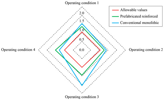 For typical operating conditions 2 to 4, fluctuations in the upstream and downstream water levels cause corresponding variations in the displacement and stress values of the prefabricated reinforced guide wall compared to condition 1. However, the overall deformation characteristics and stress distribution patterns remain similar to those under condition 1, with most regions staying in compression and only minor tensile stresses appearing locally, while the inter-layer stability is maintained. The stability safety factors for both the prefabricated and the monolithic wall under typical conditions are compared in Figure 9. The results indicate that the overall stability safety factors of the proposed prefabricated wall are comparable to those of the traditional monolithic wall and all exceed the required specification limits. This demonstrates that the prefabricated reinforced guide wall can maintain both inter-layer and global stability under different operating conditions. Furthermore, as rockfill is used as infill within the prefabricated units during assembly, the total concrete volume of the standard segment is significantly lower than that of the traditional monolithic guide wall, demonstrating advantages in efficient construction and environmental sustainability.
