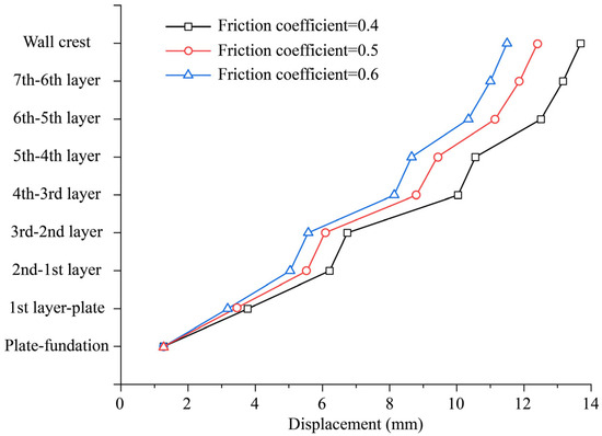 Three comparison cases of friction coefficients for concrete unit contact surfaces are set up here: Case ① with the friction coefficient reduced to 0.4, Case ② with the friction coefficient reduced to 0.5, and Case ③ with the friction coefficient taken as 0.6. The horizontal displacements of the guide wall under the three friction coefficients are shown in Figure 11.