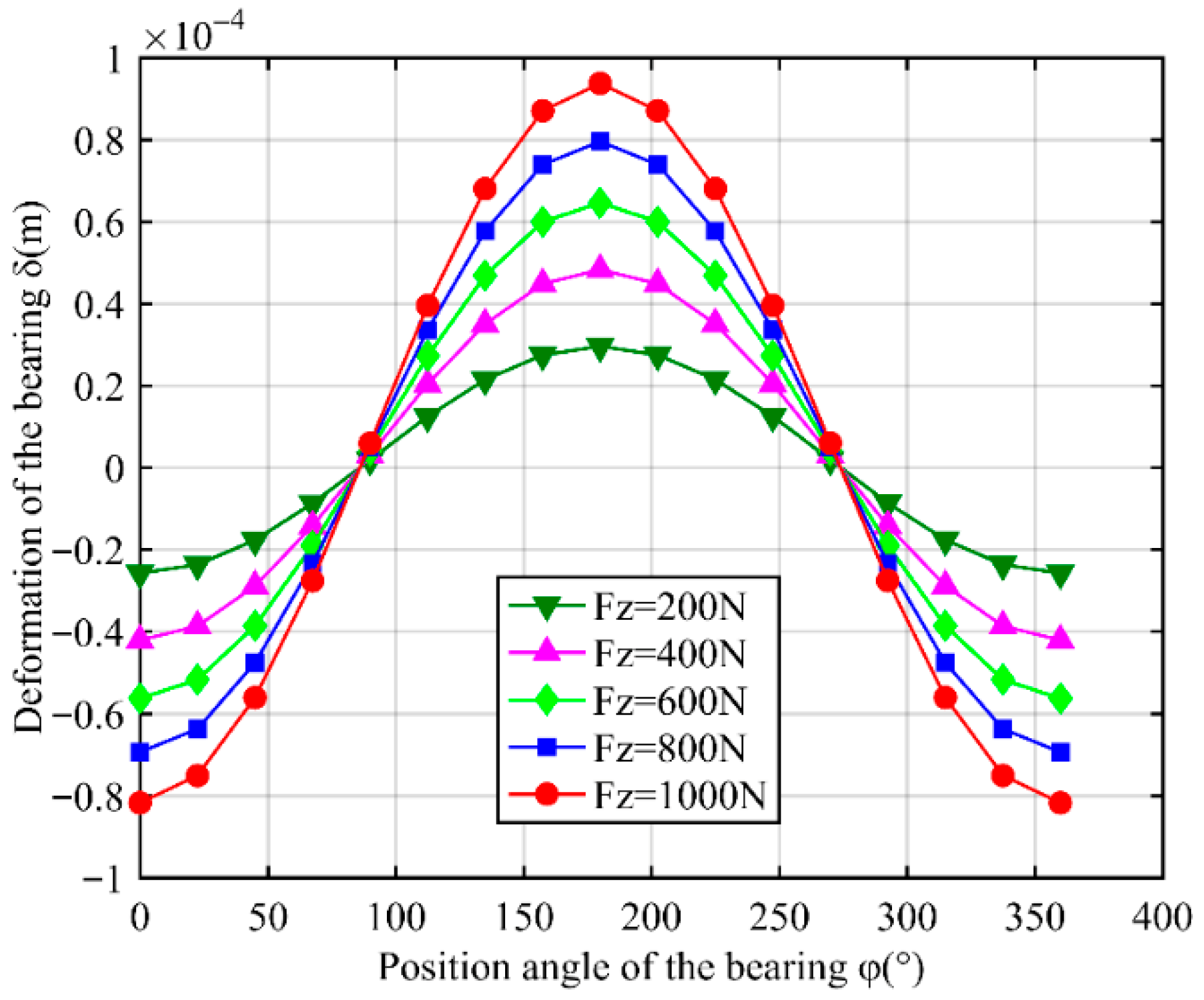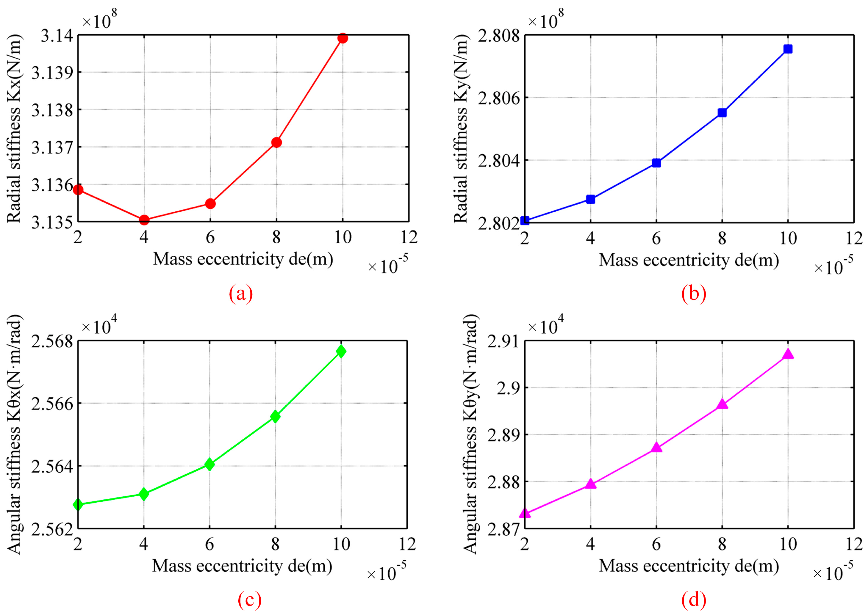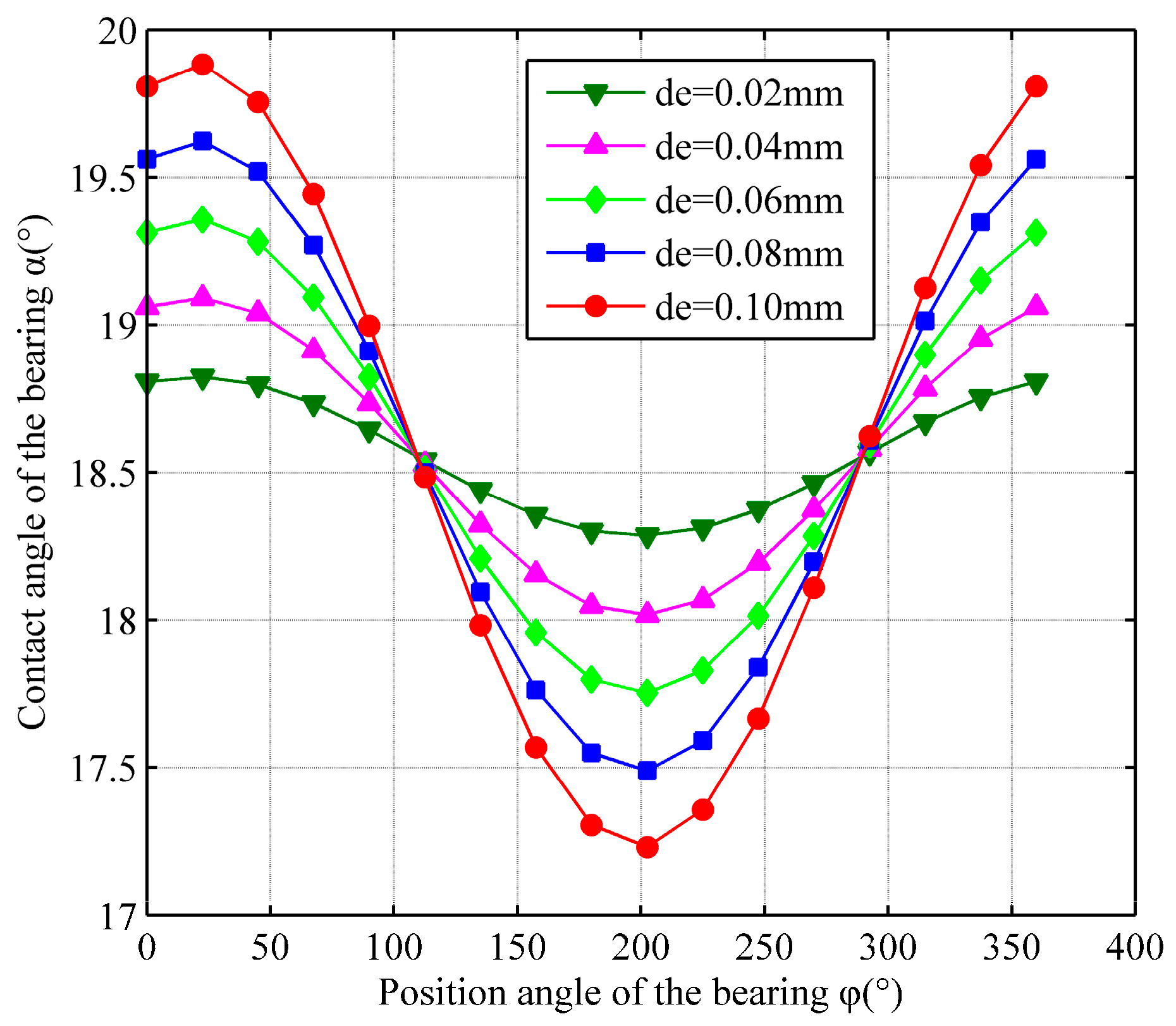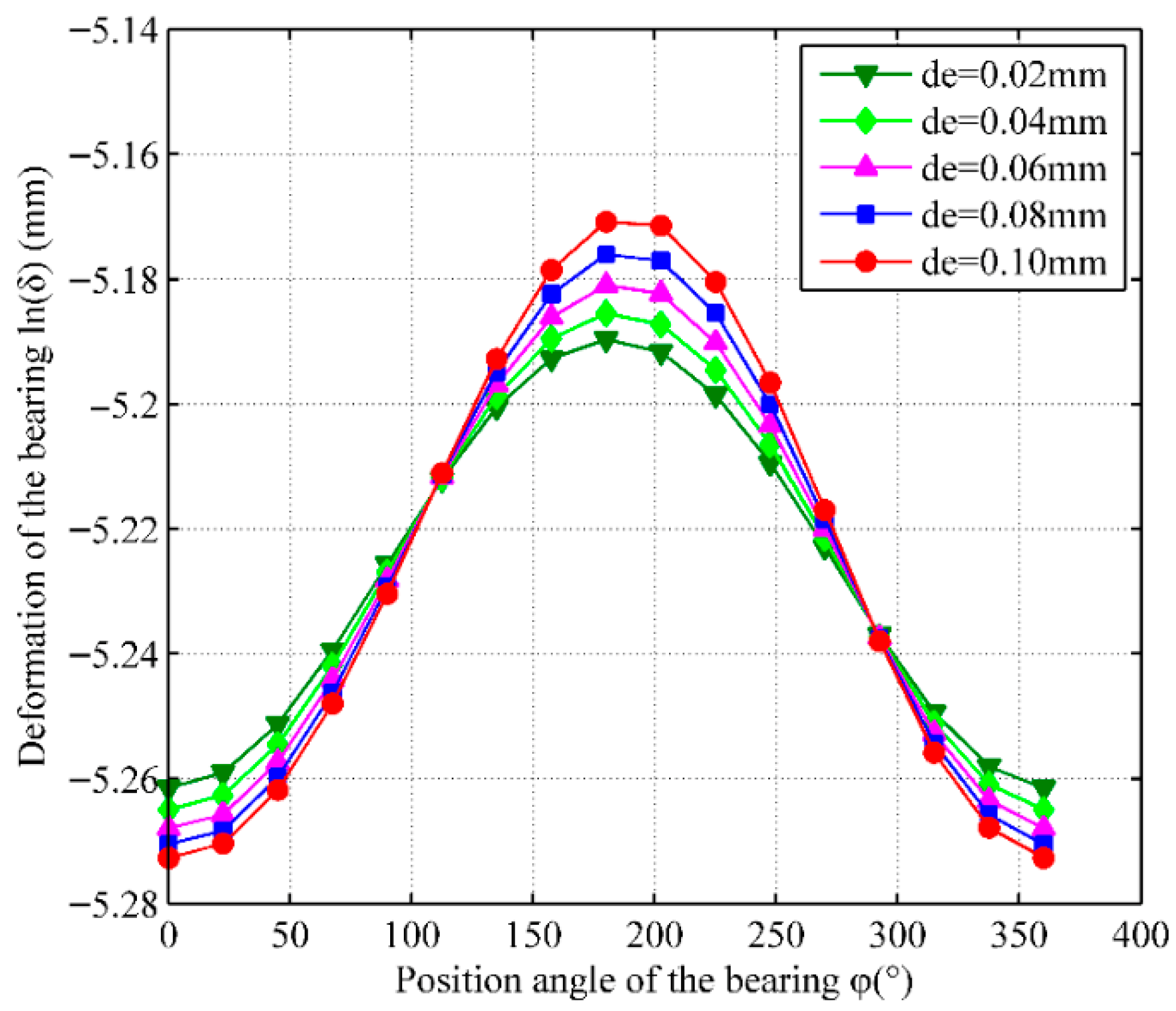 - As mass eccentricity de of the drive shaft increases, deformation δ exhibits periodic variation. When azimuth φ reaches 90° and 270°, the total deformation tends toward the same value, indicating that deformation δ is less affected by mass eccentricity de. When mass eccentricity de is 0.1 mm, Kx is increased by 0.13% and Ky is increased by 0.21%. Compared to the axial force, the mass eccentricity of the drive shaft has a relatively minor effect on the stiffness of the ball bearing.