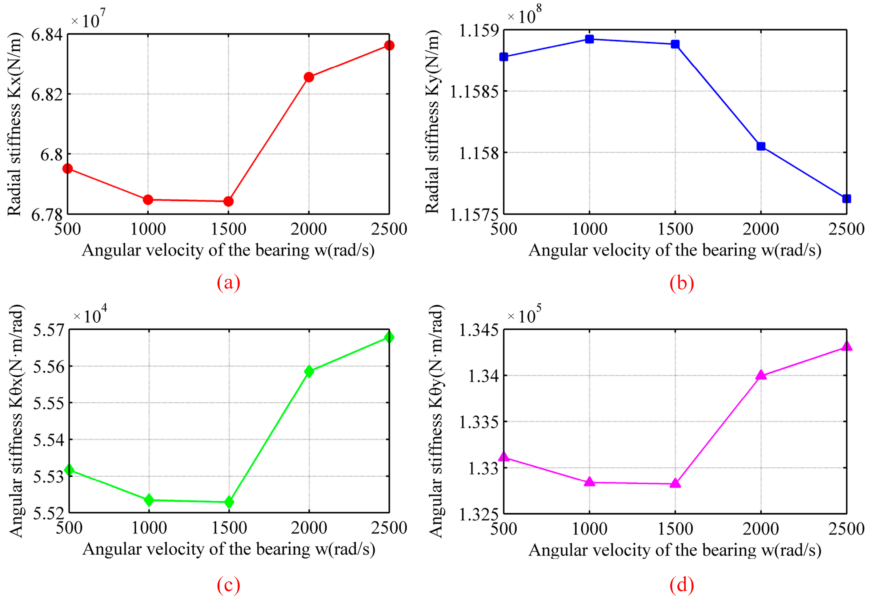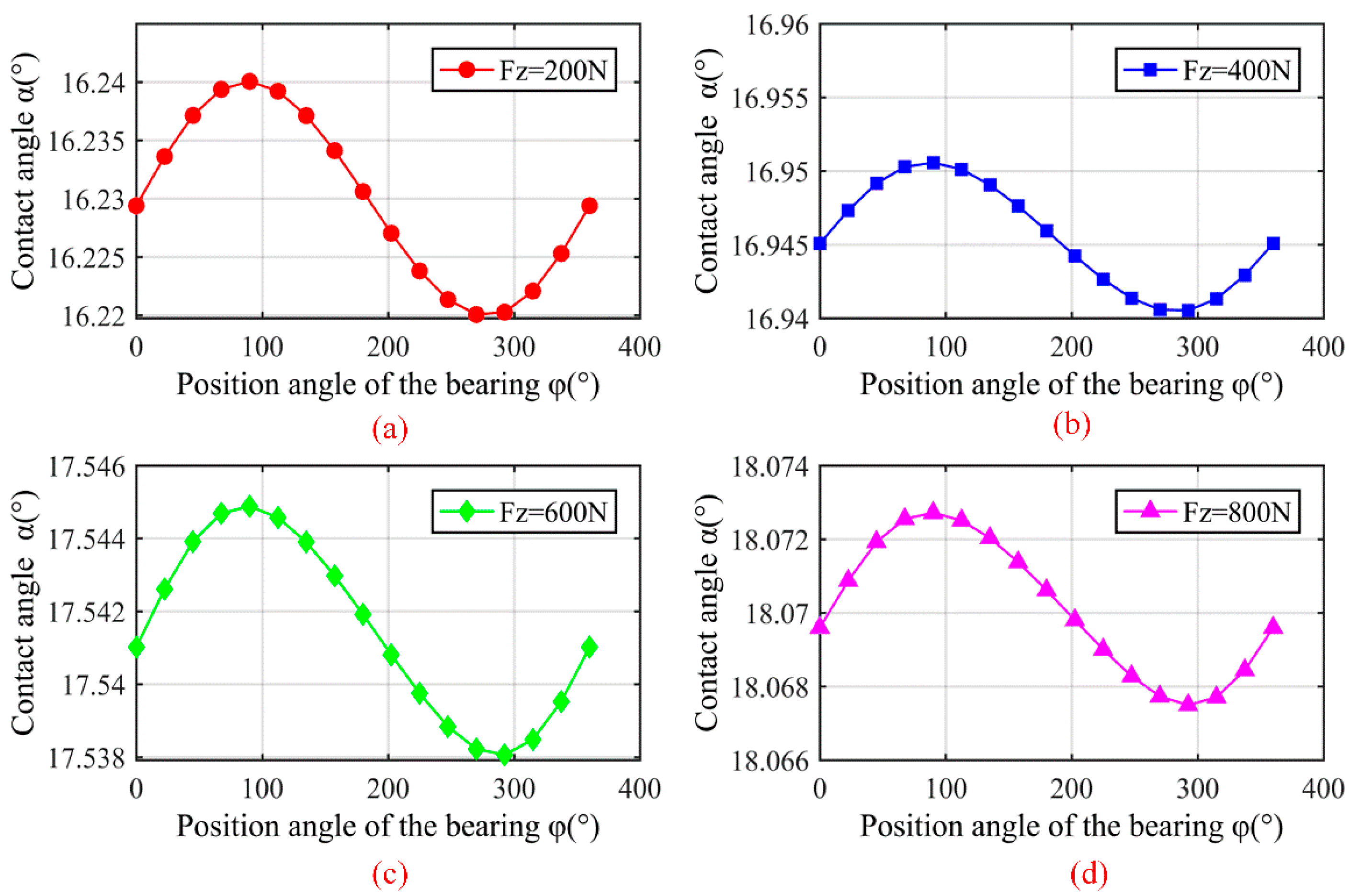 - At the same position angle, both the deformation and stiffness of ball bearings are directly proportional to the axial force. When axial force Fz reaches 1000 N, radial stiffness Kx is increased by 27.9% and Ky is increased by 47.5%. Angular stiffnesses Kθx and Kθy are increased by 78.6% and 84.6%, respectively. Compared to radial stiffness, axial force exerts a more pronounced effect on angular stiffness. Simultaneously, increasing the axial force reduces contact angle amplitude, thereby enhancing the operational stability of ball bearing systems.