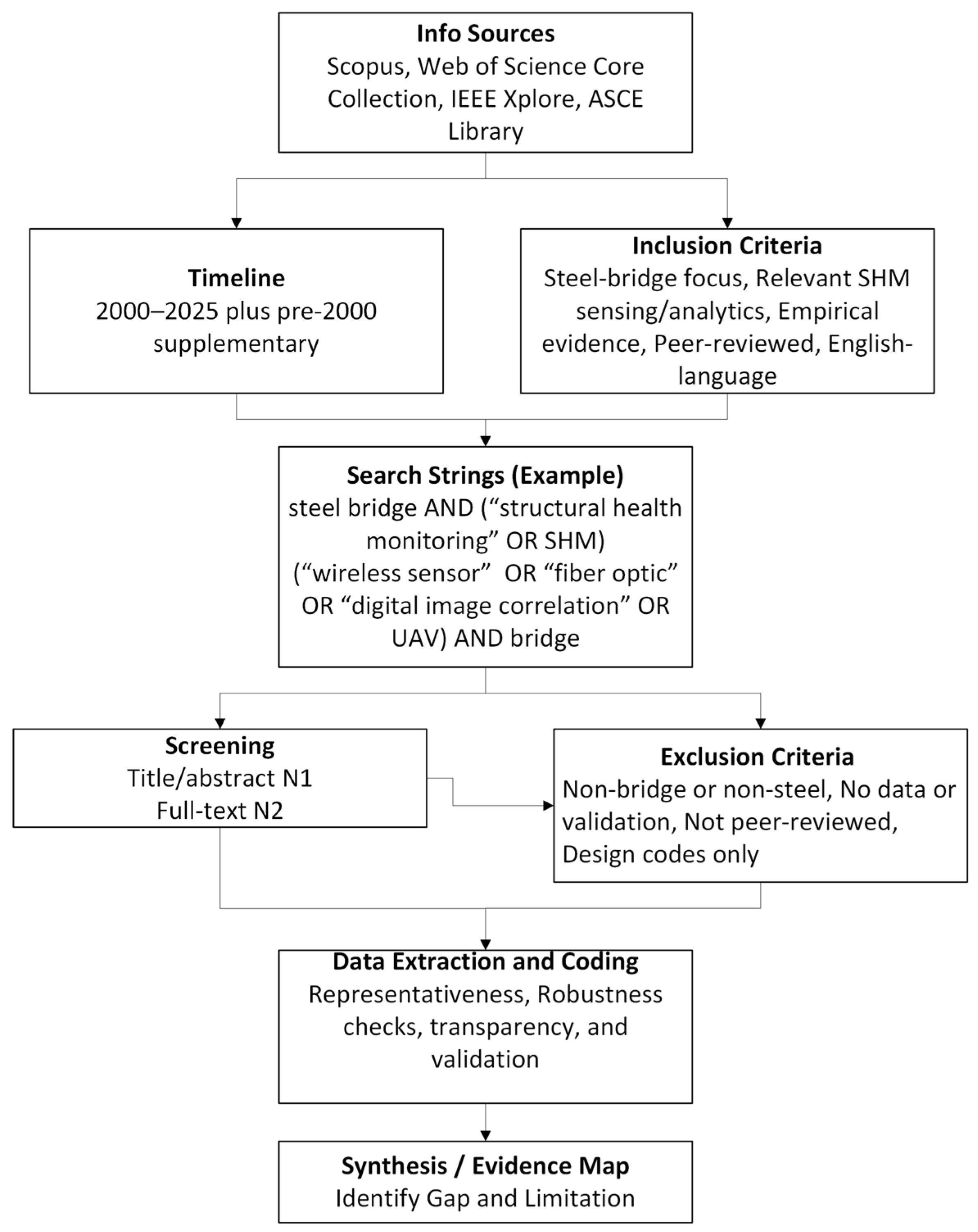 We queried Scopus, Web of Science Core Collection, IEEE Xplore, and the ASCE Library for the period 2000–2025. In addition, some references before 2000 were added as needed to serve the flow of the paper using Boolean combinations of domain and method terms. Representative strings included: steel bridge AND (“structural health monitoring” OR SHM); bridge AND (steel) AND (“damage detection” OR “condition monitoring” OR “fatigue monitoring”); (“wireless sensor*” OR accelerometer* OR “fiber optic” OR “acoustic emission” OR “digital image correlation” OR UAV) AND (bridge); and (“machine learning” OR “deep learning” OR Bayesian OR “Hilbert–Huang” OR PCA) AND (bridge OR “structural health monitoring”). Records were deduplicated before screening.