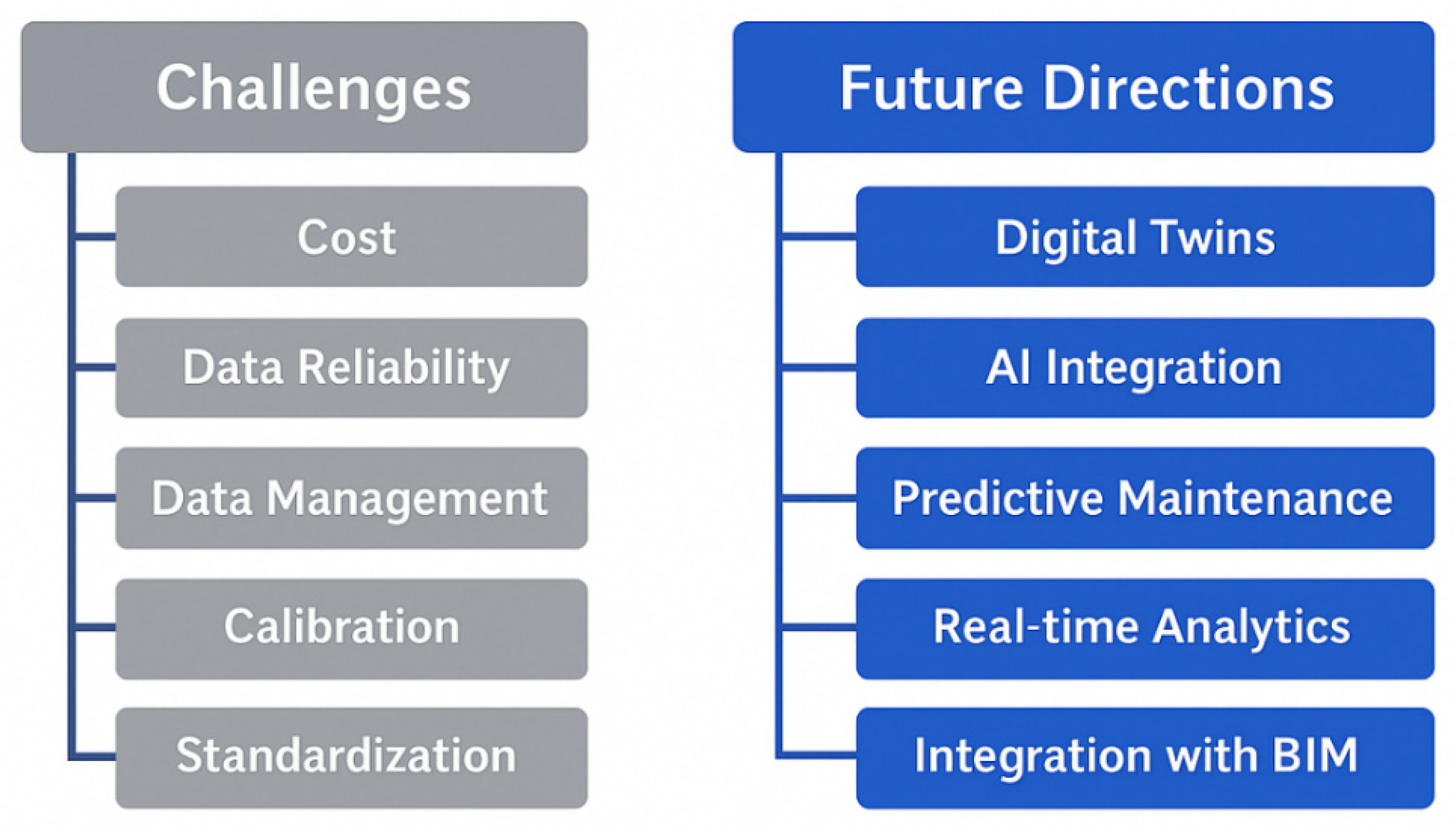 Figure 6 summarizes key obstacles and opportunities for Structural Health Monitoring (SHM). On the left, it highlights practical hurdles—cost, data reliability, data management, calibration, and standardization—that often limit deployment and comparability across projects. On the right, it points to strategic pathways forward: digital twins and AI integration enable predictive maintenance and real-time analytics, while tighter integration with BIM connects SHM insights to design and asset management workflows. Together, the diagram frames SHM’s roadmap: address foundational challenges to unlock data-driven, proactive.