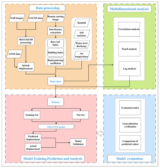 Flow chart of temporal and spatial analysis and prediction of landslide deformation using InSAR and STE-CNN.
