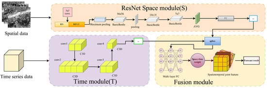This study used a Spatiotemporal Convolutional Neural Network (STCNN) to predict landslide deformation, integrating temporal and spatial information to improve prediction accuracy []. The model inputs include time series data such as rainfall, water level, and temperature, along with their corresponding lag correlation coefficients and landslide trend slopes, as well as multi-source geospatial feature datas such as backscattering coefficient, soil moisture, bare soil index, and building index. The STCNN combines the spatial extraction capability of CNN with the advantages of time series modeling, allowing it to simultaneously capture the spatial structure and temporal evolution of landslide deformation. The model uses a dual-branch architecture (S-branch and T-branch): The S-branch processes the spatial information at a single time point, feeding the grayscale images into ResNet for spatial feature extraction, then applying pooling to compress and retain key information. To extract temporal features, the T-branch performs convolution and pooling on multiple time-series data. The two feature streams are concatenated within the fusion module and passed through numerous fully connected layers to integrate spatiotemporal information, resulting in the final deformation prediction. The STE-CNN model structure is shown in Figure 3. The table of model hyperparameters is provided in Table 2.