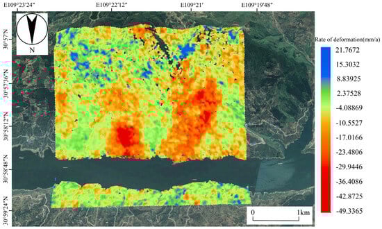 Using the time-series InSAR technology combined with GACOS, surface deformation point data for the Outang Landslide were successfully obtained. The deformation rate was categorized into 12 levels. As shown in Figure 4, the surface displacement rate in the study area exhibits a clear spatial distribution pattern. Notably, significant subsidence is observed in the Outang Landslide, while other areas remain unchanged or experience uplift. The measured data exhibits that the annual deformation rate in the study area ranges from −49.34 mm to 21.77 mm. Overall, the absolute value of annual deformation at about 83% of the monitoring points is less than 10 mm, indicating that the area is generally stable. This result is highly consistent with the characteristics of the local geological structure. As can be seen from Figure 5, the deformation rate in the study area is concentrated within the range of −20 to 0 mm/a, covering most of the region.