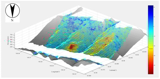 In addition, this study employs the InSAR_Plot(3D) tool in MATLAB to generate a three-dimensional visualization of landslide deformation by integrating InSAR deformation rate maps with a DEM, as shown in Figure 6.