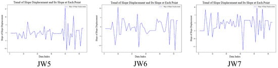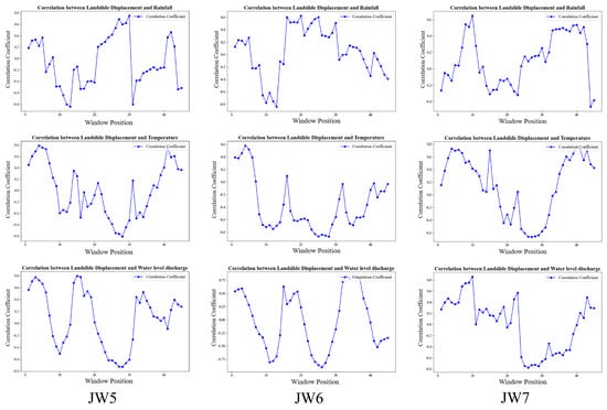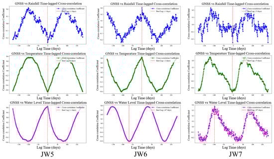 This study analyzed the lagged correlation between landslide deformation at monitoring points JW5, JW6, and JW7 through the time-lagged cross-correlation function and rainfall, water level, and temperature. As shown in Figure 8, significant lagged responses were observed for all three landslide influencing variables, with notable differences among the monitoring points. Rainfall exhibited improved correlation after introducing time lags, temperature exhibited a stable and persistent correlation with deformation, while water level demonstrated the most pronounced lag effect, with distinct correlation peaks. Overall, the landslide’s response to environmental affects varies over time, and the sensitivity differences across points highlight the complexity of the landslide mass’s internal structure and its varied response mechanisms to external forcing.