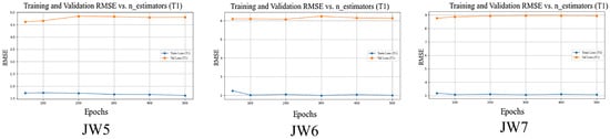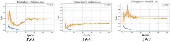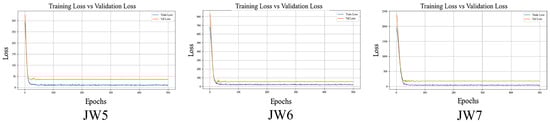 (4) Based on the evaluation metrics in Table 10, the STE-CNN model demonstrates superior predictive performance, outperforming comparative models such as STCNN, CNN, and RF across all error metrics and goodness-of-fit indicators. However, this exceptional performance also necessitates caution regarding potential overfitting risks, which may manifest in the following aspects: First, there is an imbalance between model complexity and data volume. As a complex architecture with dual spatiotemporal branches, the parameter scale of STE-CNN may exceed actual modeling requirements under limited sample conditions. Second, the model’s generalization capability varies across monitoring points. Figure 14 shows a more pronounced gap between training and validation loss at JW7 compared to JW5 and JW6, indicating inconsistent generalization performance across spatial locations. To mitigate overfitting risks and enhance model generalization, we plan to implement the following improvements in future research: Introduce time-series cross-validation strategies to rigorously separate training and testing periods, enabling more stringent evaluation of prediction stability at unknown time points; explore a simplified STE-CNN architecture that maintains core spatiotemporal feature extraction capabilities while reducing parameter scale to balance model complexity and generalization performance; and enhance the diversity and representativeness of training data through synthetic samples or physical constraint mechanisms, further improving the modeling robustness for complex landslide systems.
