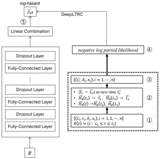 Diagram of DeepLTRC; ① estimate the baseline cumulative hazard; ② calculate as a new time ; ③ apply the new time as a survival time for subject ; ④ estimate log-hazard using negative partial log-likelihood; ⑤ train the deep neural network with the log-hazard value .