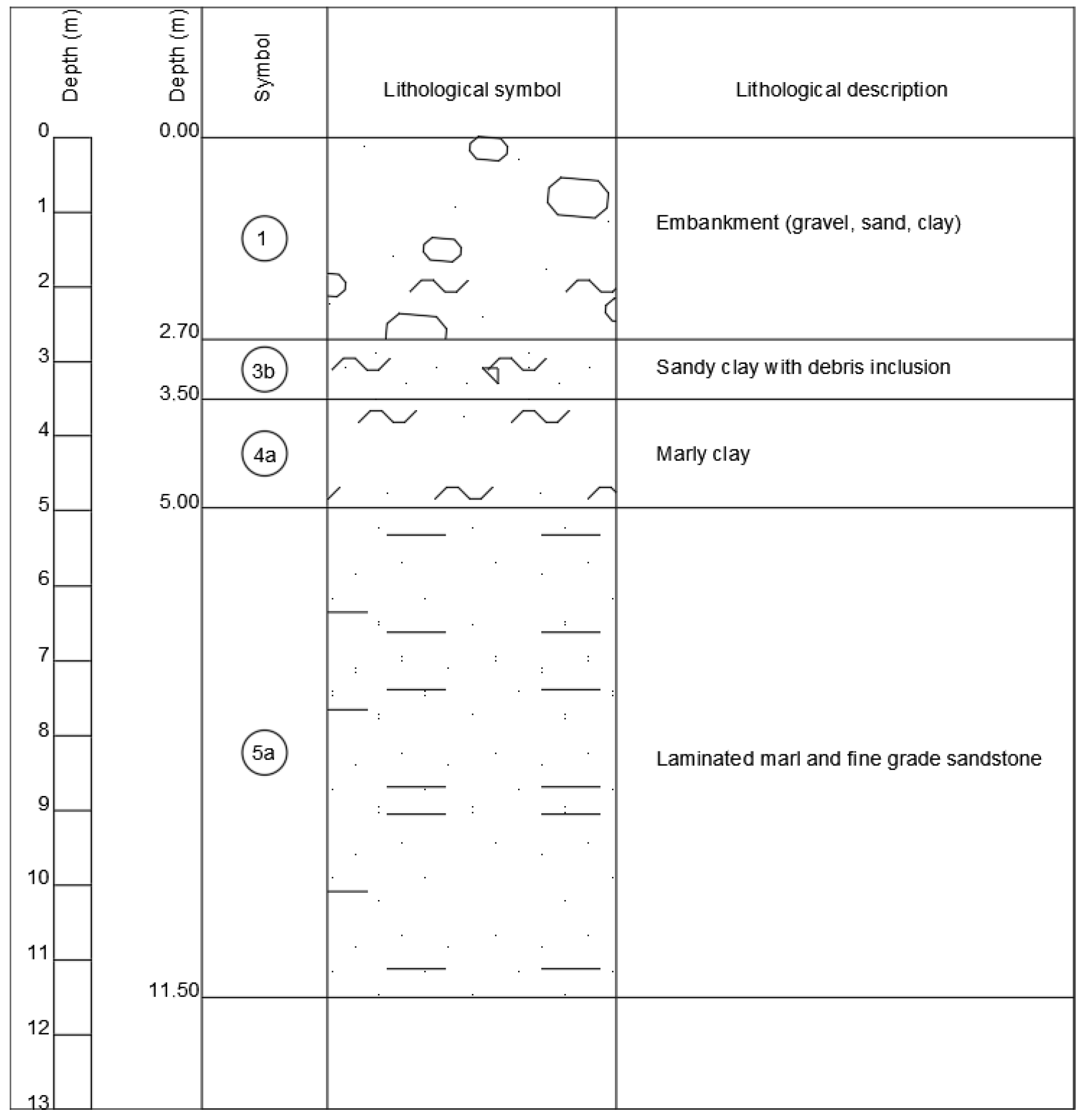 | 2 | Marl | Hardening soil | Drained | 22 | 40,000 | 120,000 | 30 | 55 |