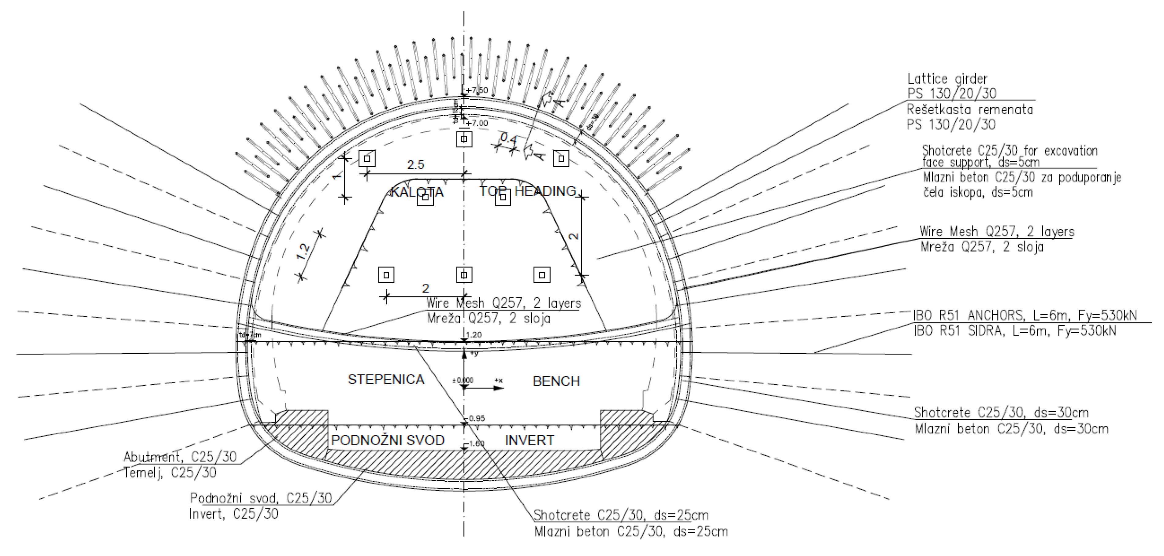 - IRGO Consulting d.o.o.; Lotus d.o.o. Glavni Projekt Izmjene Projekta Tunela Kobilja Glava“ na I Transverzali, od km 3 + 420.00 do km 4 + 180.00, Knjiga D, Mapa D.4 Tunelski Iskop; IRGO Consulting d.o.o.: Sarajevo, Ljubljana; Lotus d.o.o.: Sarajevo, Ljubljana, 2023. [Google Scholar]
