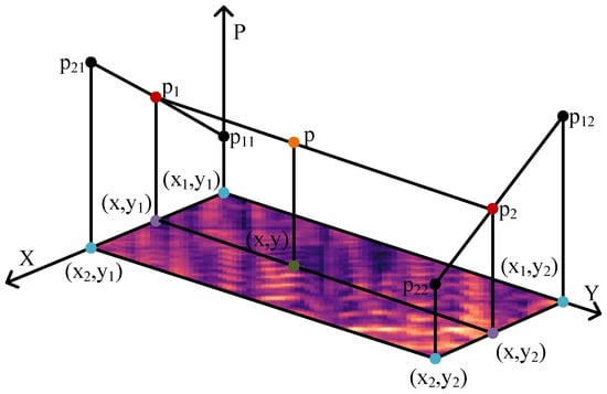 As shown in Figure 3, the X and Y axes represent positions in the FBank, while the P axis denotes the spectral energy value. The spectral energy value at the interpolation point is calculated based on known values at four coordinates: , , , and . First, interpolation is performed along the x-direction between and and and :