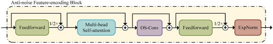 To capture multi-scale representations, the anti-noise feature-encoding block processes feature vectors from different sampling rates. As shown in Figure 4, each encoding block comprises a 4-head self-attention module, two two-layer feed-forward networks (FFNs), an OS-Conv module, and the ExpNorm normalization function. The self-attention mechanism projects the 512-dimensional input into four parallel heads of 128 dimensions each. The FFN uses an inner dimension of 2048 with sigmoid activation. These identical blocks (N = 16) are stacked to form the complete encoder.