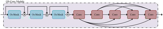 In noisy environments, the superposition of speech and noise often causes acoustic models to misclassify non-speech segments as speech. This introduces non-semantic information as valid features, degrading recognition accuracy. To address this, our OS-Denseformer incorporates an OS-Conv module to enhance local feature extraction, improving upon Conformer architectures that rely on a single convolutional module. As shown in Figure 5, this enhanced OS-Conv module consists of three OS blocks with residual connections and five densely connected depthwise separable convolution modules, collectively enhancing the network’s capacity to model complex acoustic features. When processing features from diverse noise types, the network adaptively approximates the optimal receptive field. The five depthwise separable convolution modules (kernel size = 15) enable deep abstract feature extraction. This design mitigates gradient vanishing and explosion problems caused by increasing network depth and improves feature reuse via maximized feature interactions [].