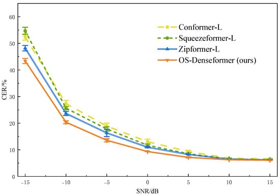 The performance advantage of OS-Denseformer grows as the SNR declines, highlighting its superior noise robustness. At −15 dB, the CER improvements reach 9.95%, 7.97%, and 4.85% relative to Squeezeformer-L, Conformer-L, and Zipformer-L, respectively. These findings underscore the model’s exceptional robustness in low-SNR conditions.