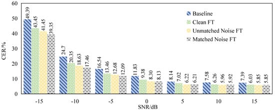 As shown in Figure 8, the CER results across different SNR conditions reveal a clear performance hierarchy: the pre-trained model without fine-tuning showed the highest CER, followed by the model fine-tuned only on clean speech. The model fine-tuned with noise-augmented data achieved better performance in unmatched noise conditions and the best performance in matched noise conditions. The comparative analysis revealed that fine-tuning with noise-augmented datasets most effectively improves speech recognition accuracy under strong noise interference. Specifically, when fine-tuned on matched noise data, the model achieved CER reductions of 1.37%, 2.89%, and 4.1% at −5 dB, −10 dB, and −15 dB SNR, respectively, compared to the model fine-tuned on clean speech.