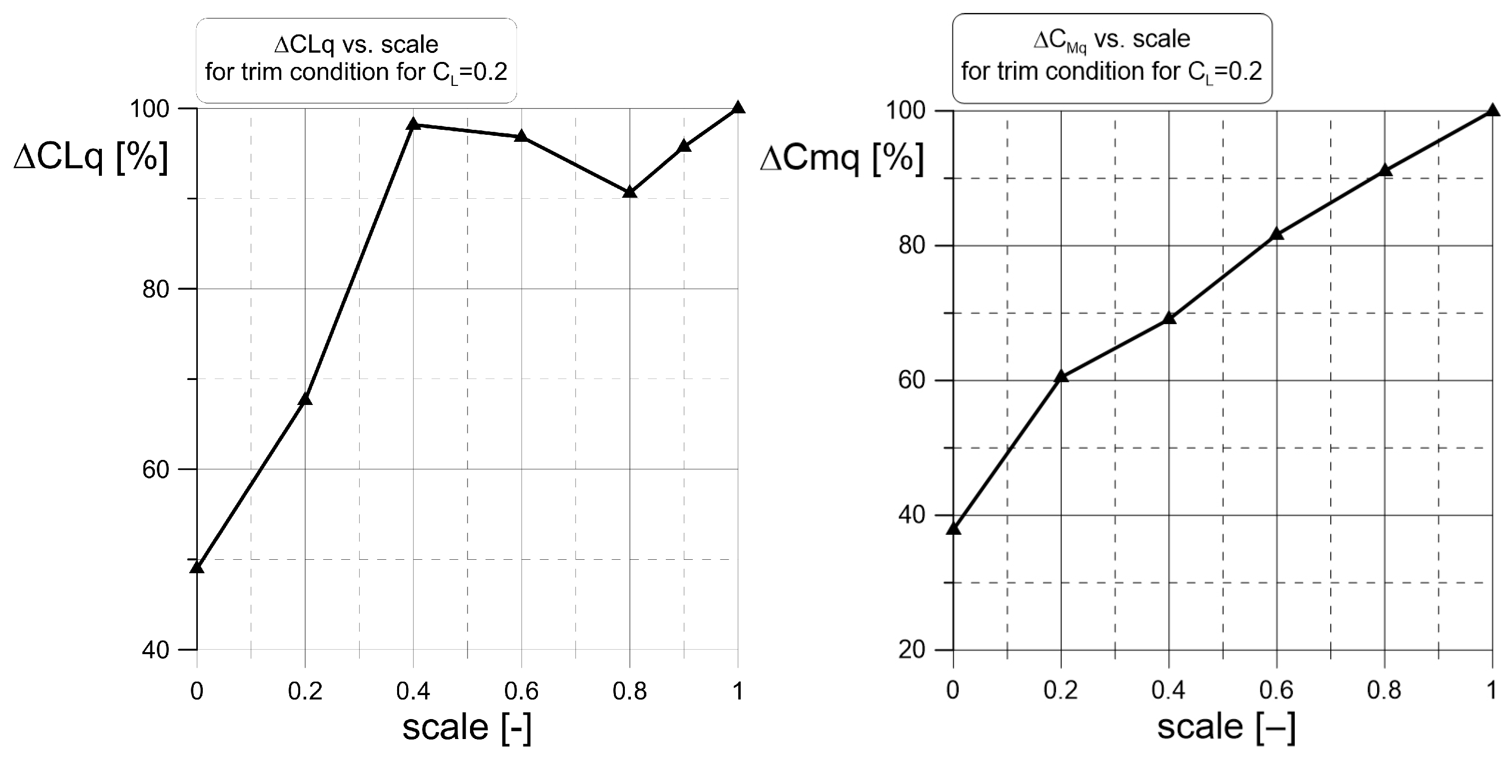 - Kwiek, A. A numerical study into the longitudinal dynamic stability of the tailless aircraft. Aircr. Eng. Aerosp. Technol. 2019, 91, 428–436. [Google Scholar] [CrossRef]