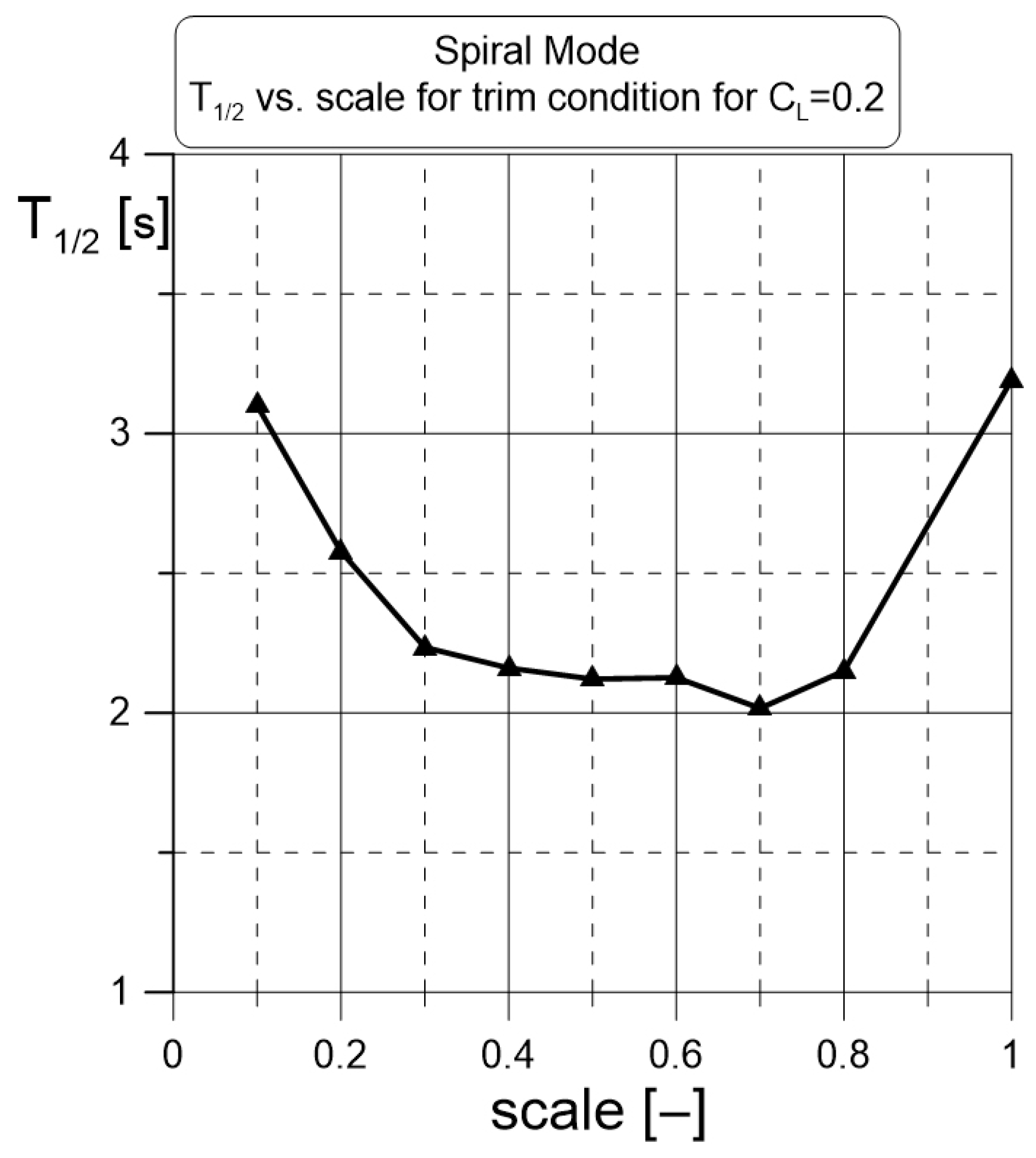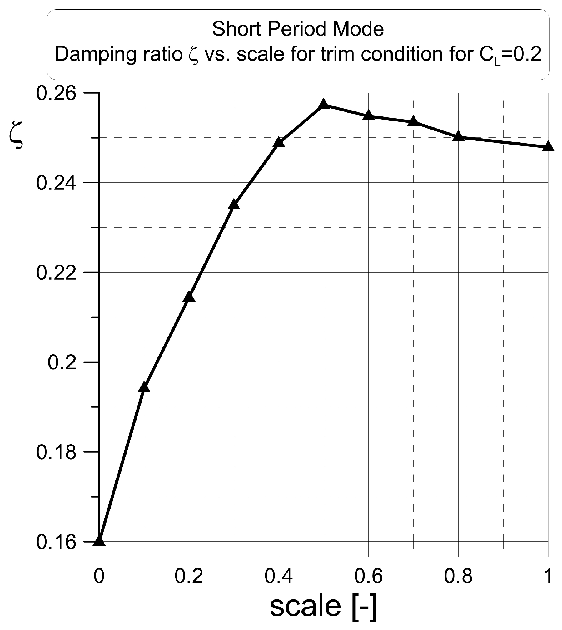 - It first increases (down to scale of 0.5) and then decreases the short-period damping ratio, with the lowest value reached for no winglets.
