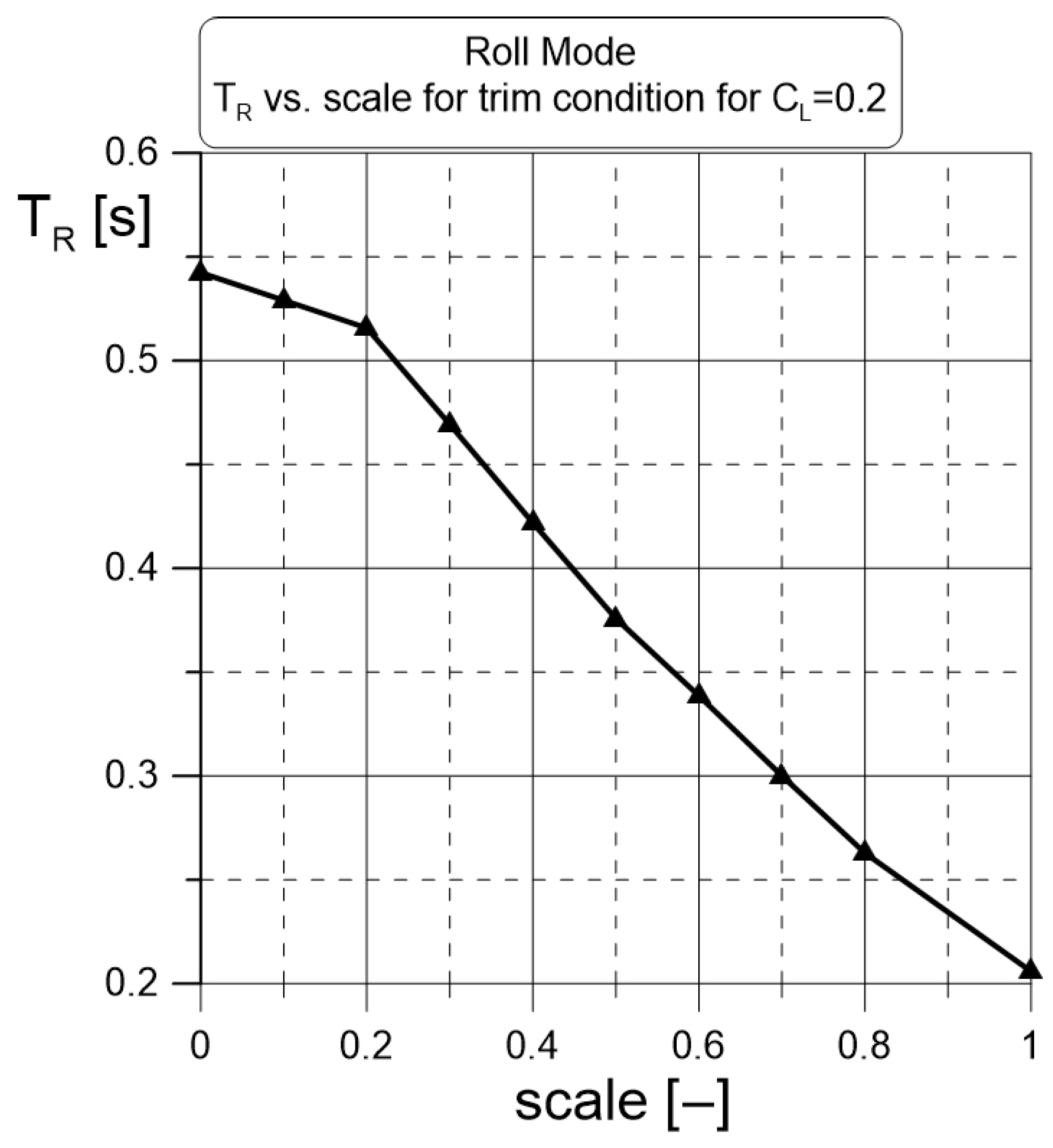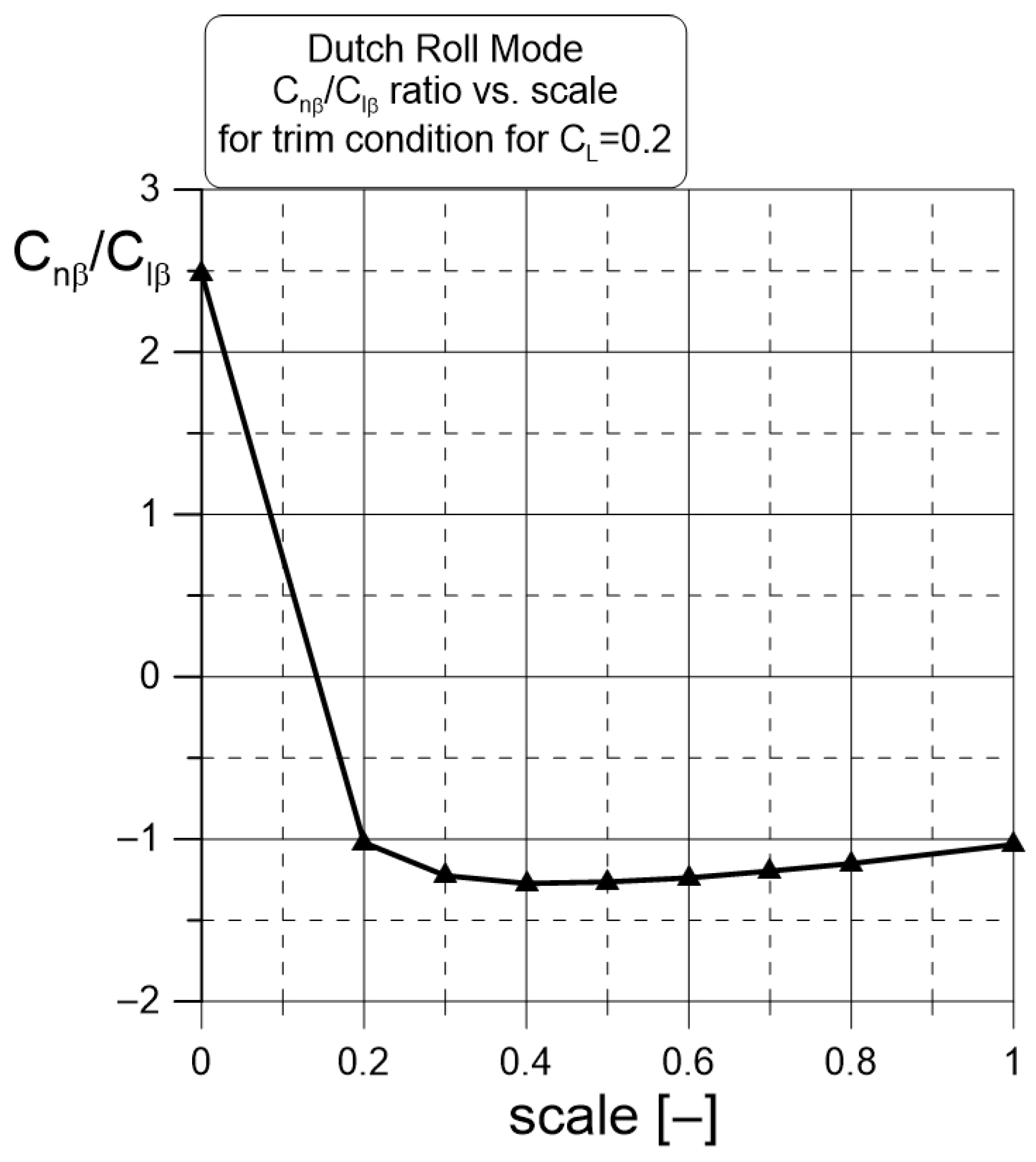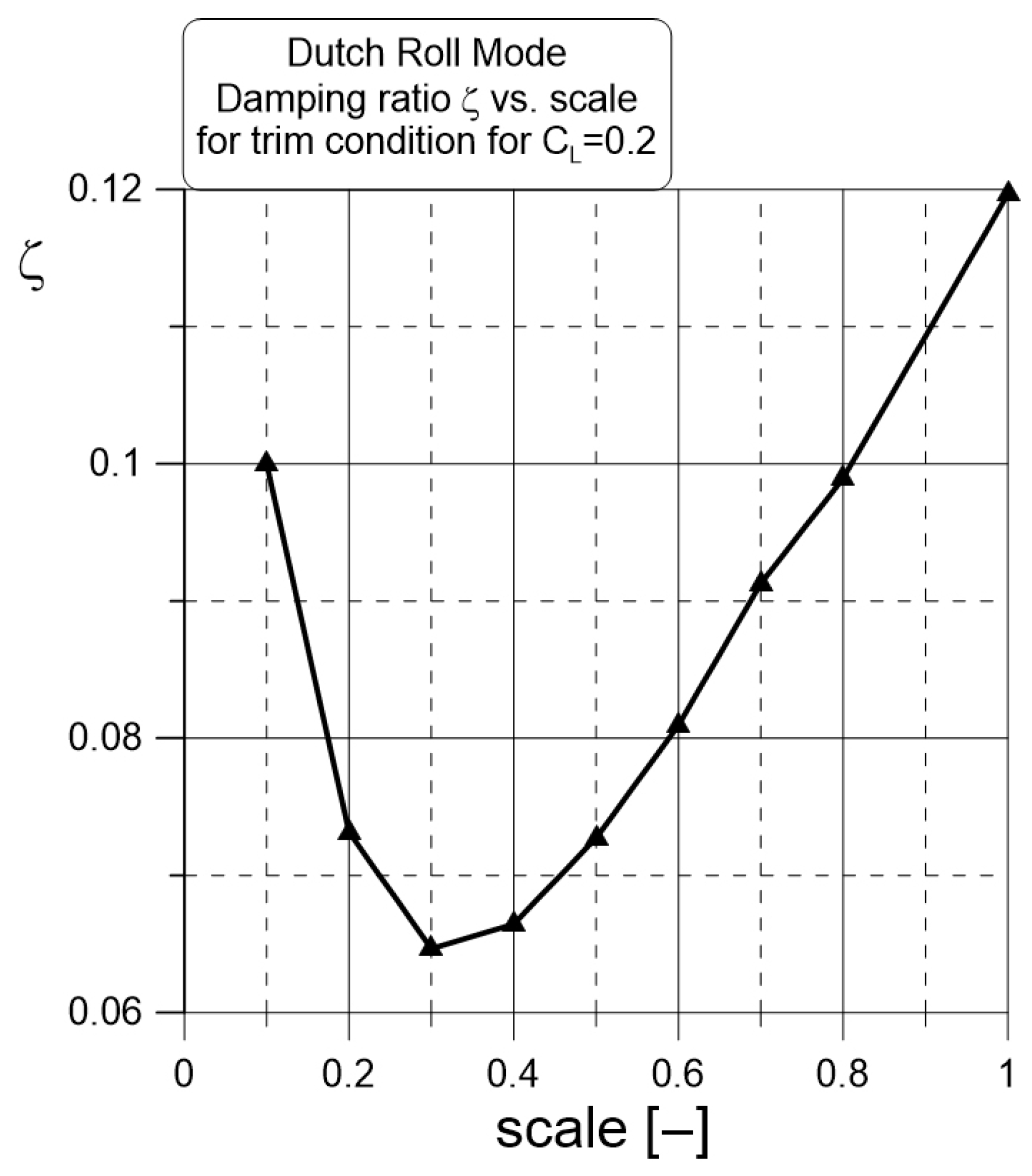 - It first decreases (down to scale of 0.3), and then increases the Dutch roll damping ratio;