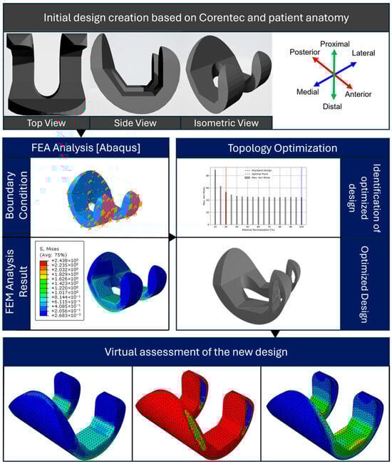The design task is formulated employing material interpolation techniques, such as SIMP or rational approximation of material properties (RAMP), with a penalty factor of 3 to promote discrete material distributions. The optimization problem is defined by specifying design responses (e.g., strain energy density, volumetric constraints) and formulating an objective function. The algorithm iteratively modifies the material distribution within the design domain to extremize the specified criteria, subject to imposed constraints. Upon achieving convergence, the optimization algorithm generates a new implant geometry. This optimized design undergoes virtual validation to ensure compliance with the performance metrics and manufacturing constraints. In cases of non-convergence or unsatisfactory results, the optimization parameters and constraints are recalibrated, and the process is iterated. The final phase comprises a comparative analysis between the optimized design and the initial model. This evaluation quantifies improvements in mechanical performance indices and material utilization efficiency, providing a robust basis to assess the efficacy of the optimization methodology. The proposed framework ensures a comprehensive and systematic approach to knee prosthesis design. The estimated contact surfaces of the femoral component and the tibial polyethylene spacer were modeled with matching curvature radii derived from standard implant geometries to maintain physiological articulation. These contact radii were held constant during topology optimization to isolate the influence of internal topology from geometric surface variations.