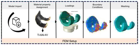 The femoral component of the knee prosthesis was constructed based on the extracted dimensional parameters, with particular attention paid to the articulating surfaces and overall geometry. The 3D CAD model served as the foundation for the creation of the FEA model. The assembled model of the femoral component and plastic spacer was subjected to loading using finite element analysis (FEA) software. Figure 3 shows the FEM setup process for knee prosthesis analysis. The workflow illustrates the key steps: model import, material assignment (Ti–6Al–4V), loading application (1150 N axial force), boundary condition definition, and finite element meshing, preparing the prosthesis model for the finite element simulation.