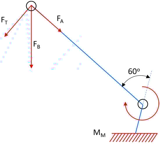 Post-modeling in SolidWorks, the 3D representation was exported and imported into ABAQUS, an advanced finite element analysis (FEA) software suite. This transition enables sophisticated computational analysis and simulation of the prosthesis under various loading conditions and kinematic scenarios. It can be challenging to calculate the loads acting on the knee joint under real-world working situations, so for the sake of simplicity, in this scenario, we streamline the load analysis to a single-leg support scenario. The force exerted by the whole body, i.e., the body force (FB), is transferred through the hip joint and exerted onto the femur, where it is divided into two components: an axial force (FA) parallel to the femoral axis and a transverse force (FT) perpendicular to it. It can be deduced as follows by first establishing equilibrium in the femur/knee system, and assuming that the lower segment of the tibial component is fixed. Since the knee is a cylindrical joint, its response is limited to the axial load FA. In contrast, the muscles counteract the force FT and the resulting moment by producing a reactionary moment (MM), in addition to axial and transverse forces. Figure 5 shows a schematic of the human skeleton with these forces applied. In this concept, the femur and tibia are considered link elements, and the hip, knee, and ankle are considered cylindrical joints.