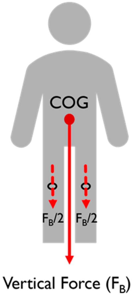 The FE code models the bonding between the femoral and tibial components as a complete constraint between the bodies, preventing any reciprocal motions or rotations. Based on the considerations in Ref. [], friction contact is anticipated between the femoral component and the PE tibial insert, with a friction coefficient of 0.01. When a person is standing with both feet firmly planted on the ground, their body weight’s vertical force (F+) is appropriately directed through their center of gravity (COG). Figure 6 shows that the force is distributed equally between the two legs in this position and travels via the knee joint. The anteroposterior, lateromedial, femoral, and tibial mechanical axes were parallel in the orientation of the femoral component and plastic spacer, which were in contact. For optimal results, the femoral component and plastic spacer were aligned at 100% of the deep knee bend cycle, as contact stress is maximized at this stage []. Continuous bonding was used to represent the contact surface between the plastic spacer and the femoral component. Between two implants, a tangential contact condition was used, and a 0.07 coefficient of friction was assumed [,].