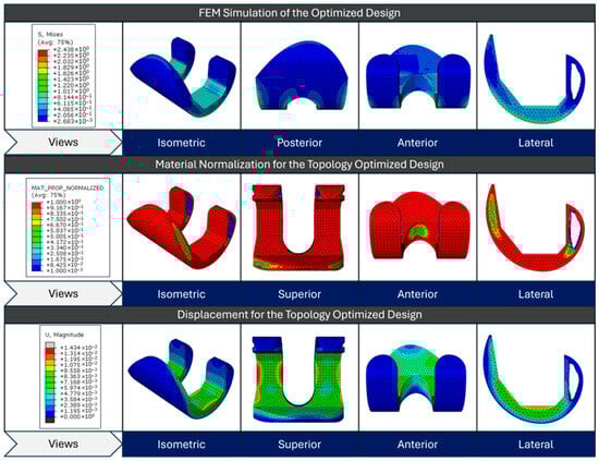 The top row displays the initial design’s FEM simulation results, showing the von Mises stress distribution across various views (isometric, posterior, anterior, and lateral). The material normalization contour of the topology-optimized design is depicted in the center row; red areas denote high material density regions, while blue areas denote low density or material removal regions. This optimization aims to redistribute material efficiently, while maintaining structural integrity. The bottom row depicts the displacement magnitude for the optimized design under loading conditions, with colors ranging from blue (minimal displacement) to red (maximum displacement). These three sets of images collectively demonstrate how topology optimization transforms the initial design by strategically removing material to create a more efficient structure that balances stress distribution and minimizes displacement, while reducing weight.