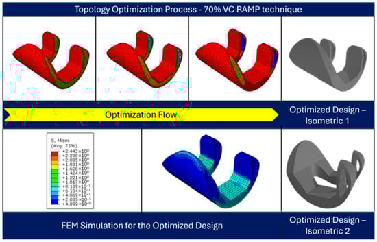Figure 14 illustrates the topology optimization process for a knee prosthesis component using the RAMP material interpolation technique with a 70% volume constraint. The top row shows the evolution of the design across the optimization design process, where red areas indicate high material density, and blue areas represent material removal. This progression demonstrates how the algorithm refines the component’s shape, strategically removing material while maintaining structural integrity. The solid gray model presents the final optimized design. The bottom row displays the FEM simulation results for the optimized design, with a color-coded von Mises stress distribution. The stress map ranges from blue to red (low to high stress), revealing how loads are distributed across the optimized structure. Two isometric views of the final design are provided, offering a comprehensive look at the form and stress patterns of the optimized component.