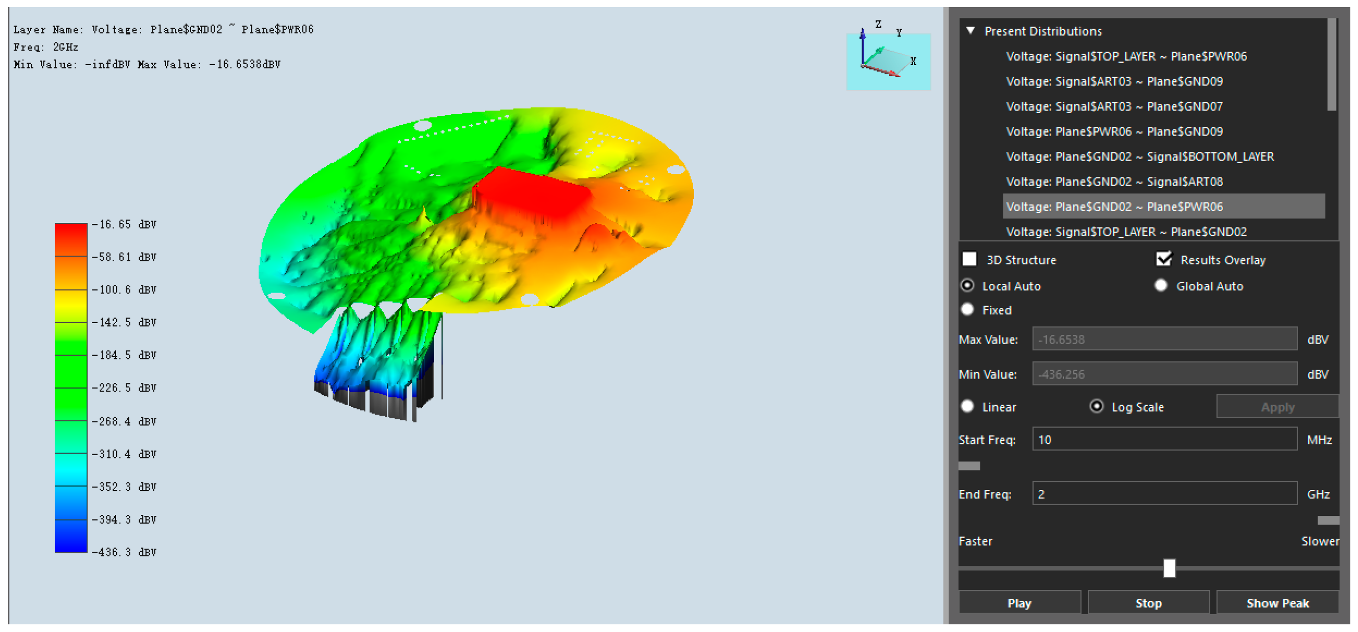 Port Settings: Port 1 connected to the power plane (PWR06); Port 2 connected to the ground plane (GND02).