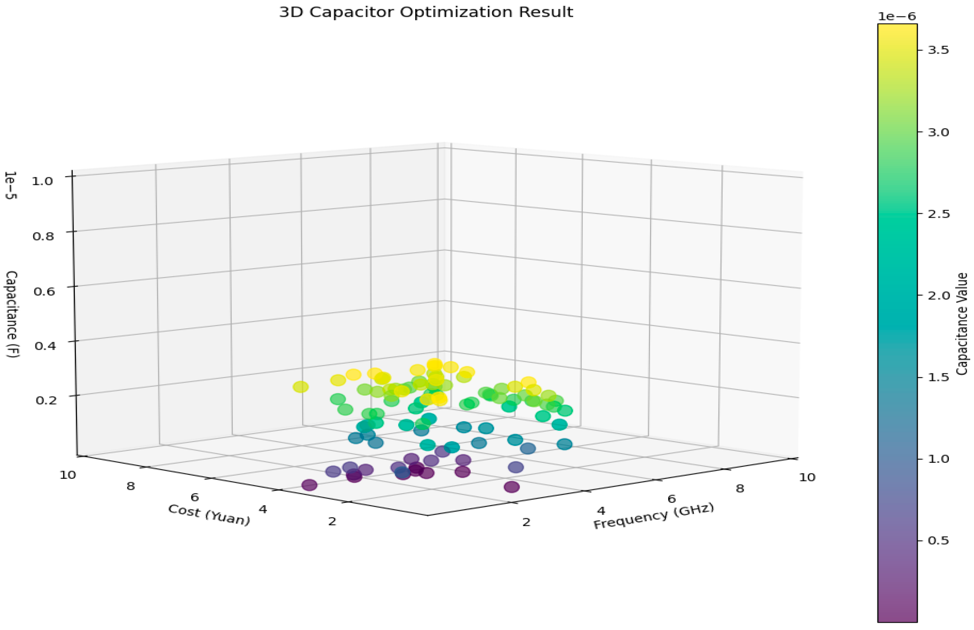 Figure 8 presents the distribution of parameters such as capacitance and frequency in 3D space, intuitively showing the distribution of optimization results under multi-parameter interaction.
