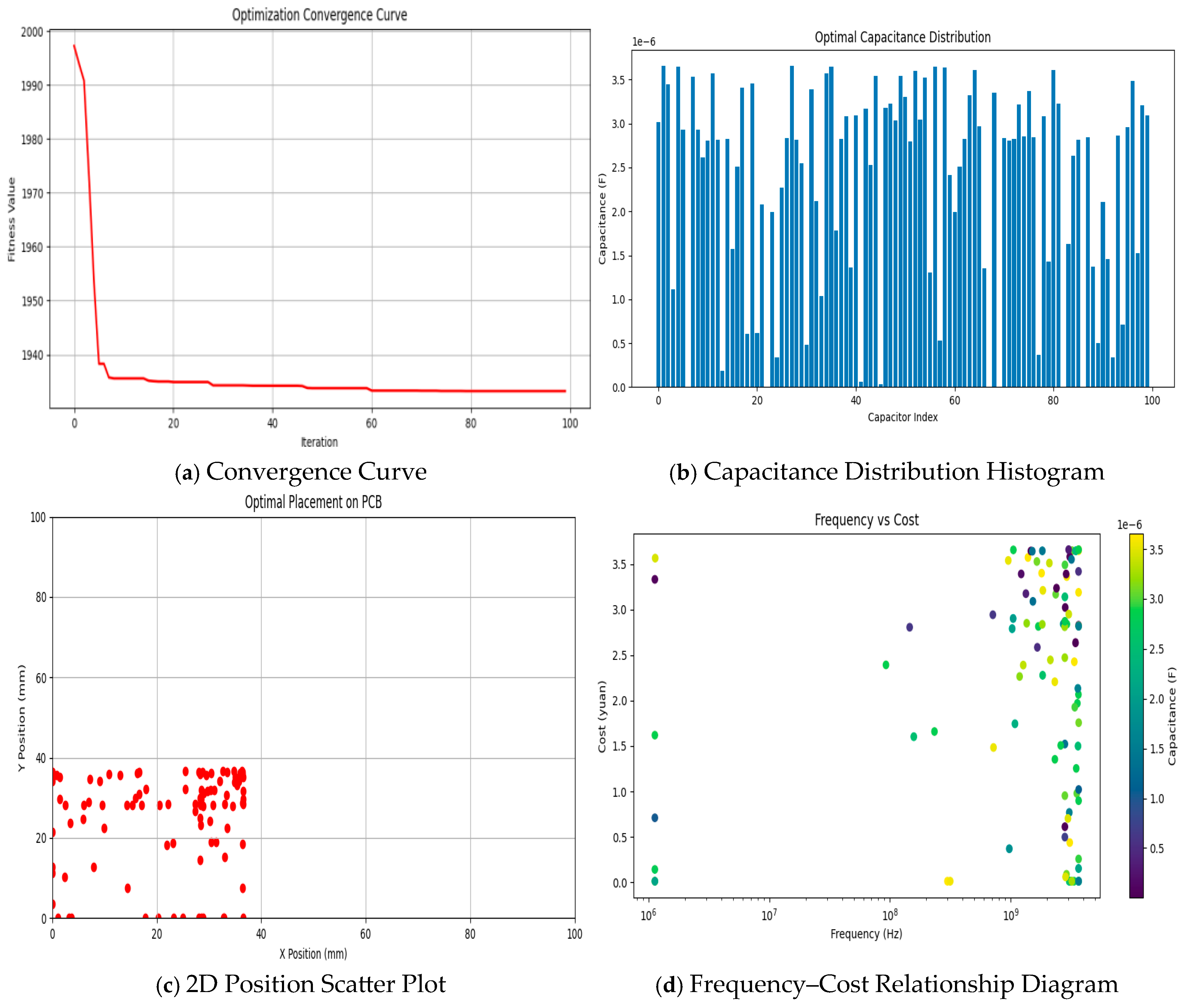 Figure 9 shows the results diagrams from different aspects: (a) reflects the change in the objective function value during the algorithm iteration process, which decreases rapidly and then tends to be stable, demonstrating the fast and stable convergence speed of the SOA algorithm; (b) shows the distribution of different capacitor values after optimization, reflecting the distribution characteristics and range of capacitor values; (c) presents the position distribution of the optimized objects in the 2D plane, reflecting the distribution of position parameter optimization results; (d) reflects the correlation between frequency and cost, facilitating the analysis of cost changes under different frequencies and providing guidance for capacitor selection and placement.