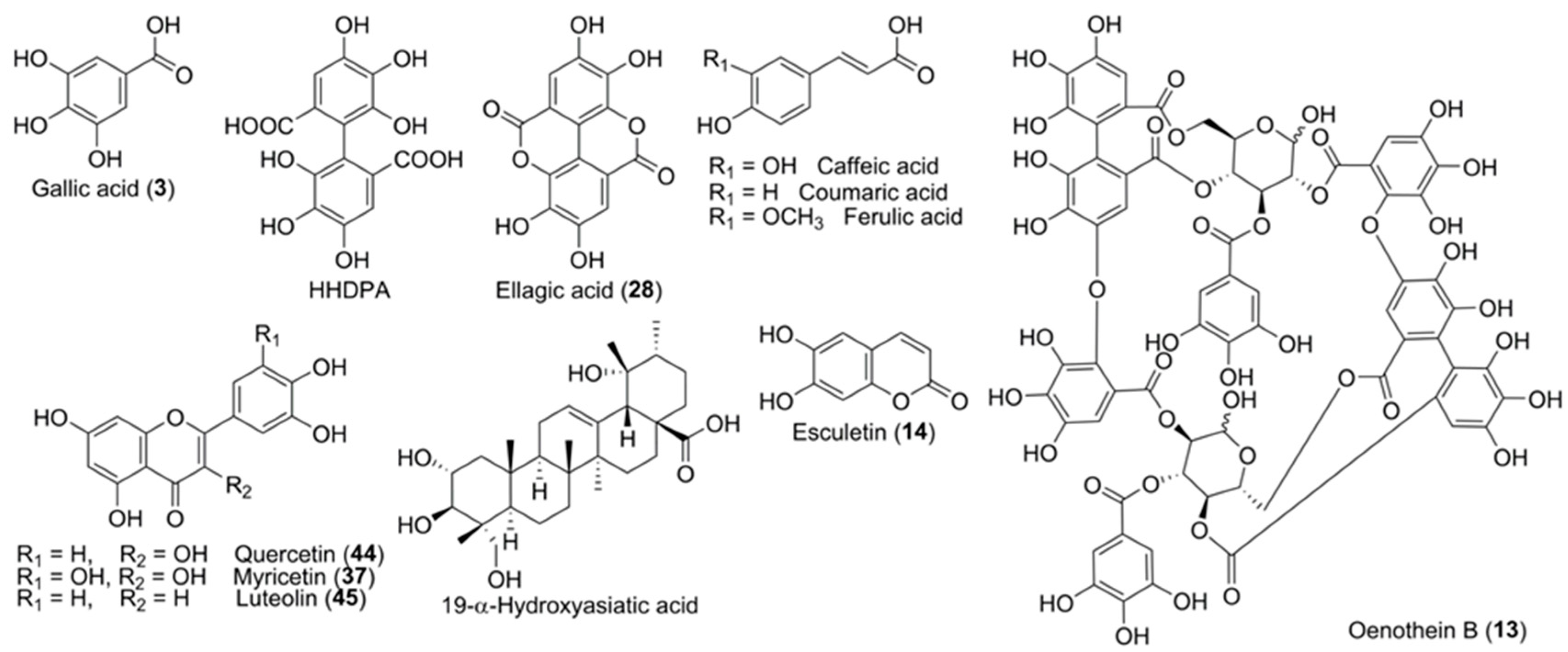 In the TIC (total ionic chromatogram) of the extracts from E. parviflorum, three compounds (13, 16 and 18) were found, with low abundance [M-H] ion at m/z 1567.1445 and an ion at m/z 783.0701 ([M-2H]2−) with the highest relative abundance. This finding is in accordance with the molecular formula C68H48O44. In the extracts of plans of Epilobium genus (Onagraceae family), oenothein B is the dominating compound [39,40]. RP-UPLC analysis of extract from the aerial parts of E. parviflorum 80% ethanol extract showed that the main substance with retention time 5.70 min had absorption maximum at 262 nm. The obtained daughter ions in MS/MS spectrum of compound 13 are in accordance with fragmentation of oenothein B [41]. The compounds 16 and 18 had practically identical MS/MS spectra and were probably isomers of oenothein B.