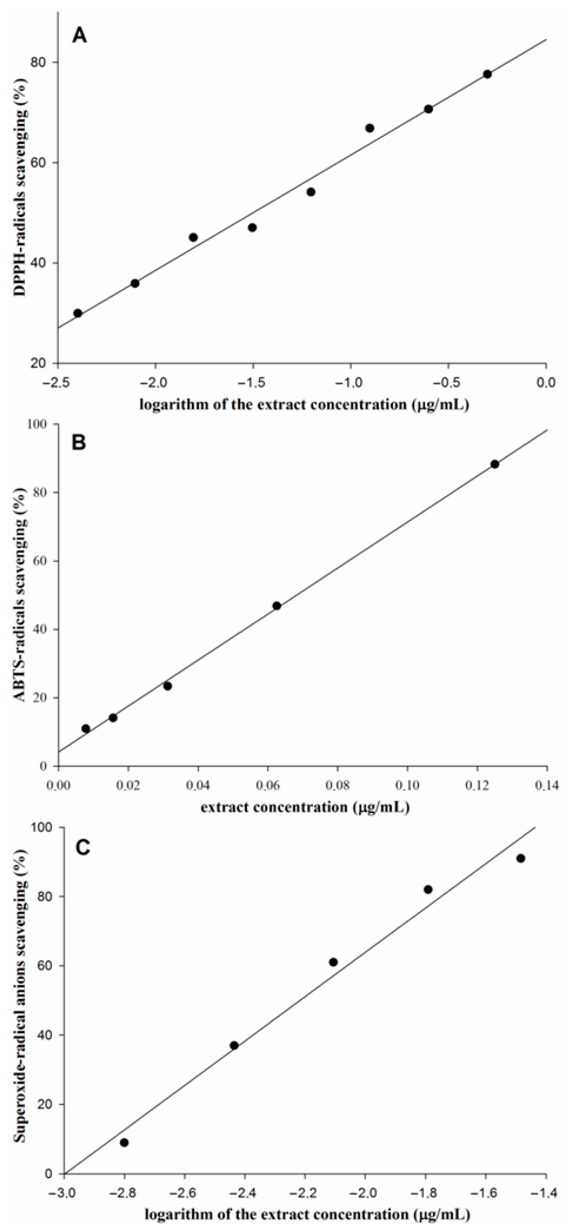 The procedure was performed as described by Brand-Williams et al. [24]. Dry extract was dissolved in DMSO and added to 0.2 mM methanolic DPPH solution to obtain twice increasing concentrations of the tested material (from 0.004 to 0.5 mg/mL). The incubation was performed for 30 min at 25 °C. After that, the absorbance of the samples was measured at 517 nm on ELISA reader (TECAN, SunriseTM). A solution of the extract in methanol (in a corresponding concentration) served as a blank and the solution of DPPH in methanol served as a control.
