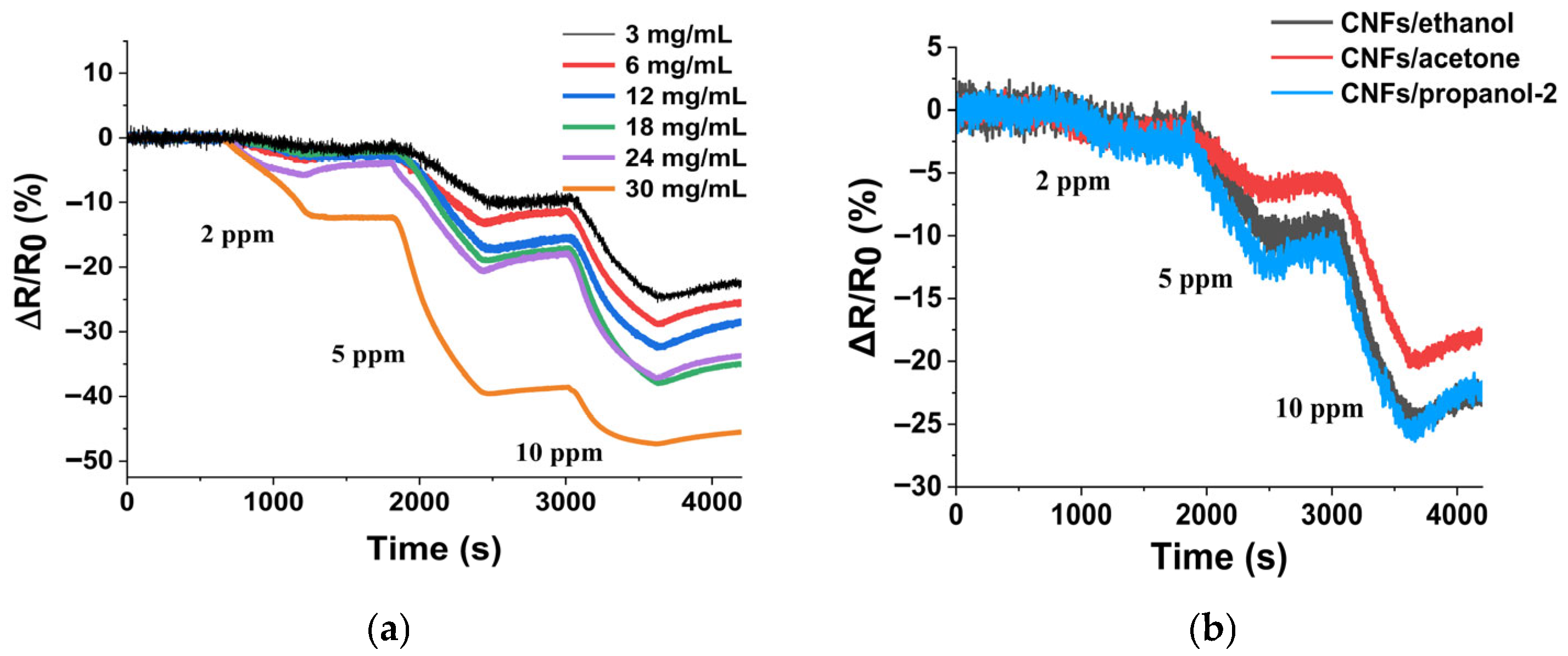 - Bannov, A.G.; Lapekin, N.I.; Kurmashov, P.B.; Ukhina, A.V.; Manakhov, A. Room-Temperature NO2 Gas Sensors Based on Granulated Carbon Nanofiber Material. Chemosensors 2022, 10, 525. [Google Scholar] [CrossRef]